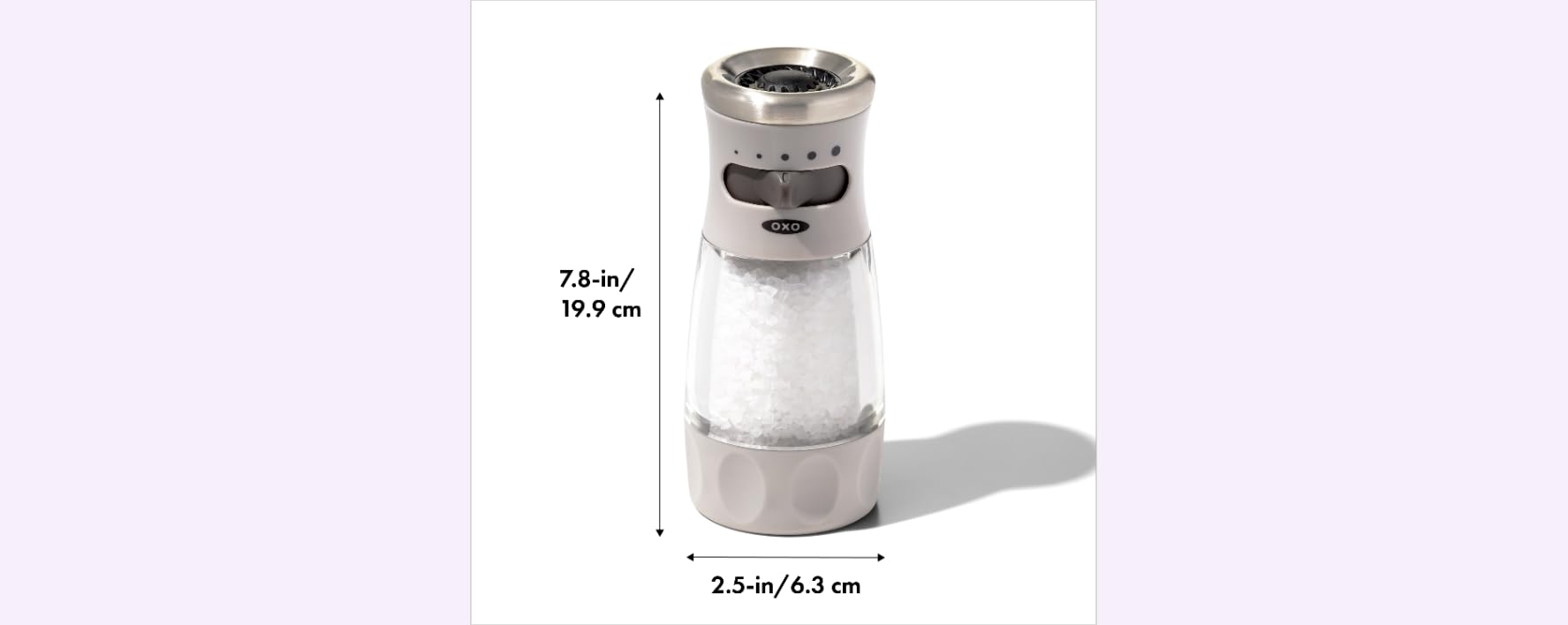Details: The sleek and stylish OXO Good Grips Contoured Mess-Free Salt Grinder is an ideal addition to any kitchen or dining table. This manual Grinder has stainless steel accents plus a clear acrylic body, so you'll know when it's time to refill. Slide the tab to choose one of five levels of grind, from fine to coarse. An airtight lid keeps salt fresh and dry while the non-slip grip allows for easy, comfortable use. Grind and serve from the top for mess-free storage. Comes pre-filled with coarse salt. Hand-wash only.