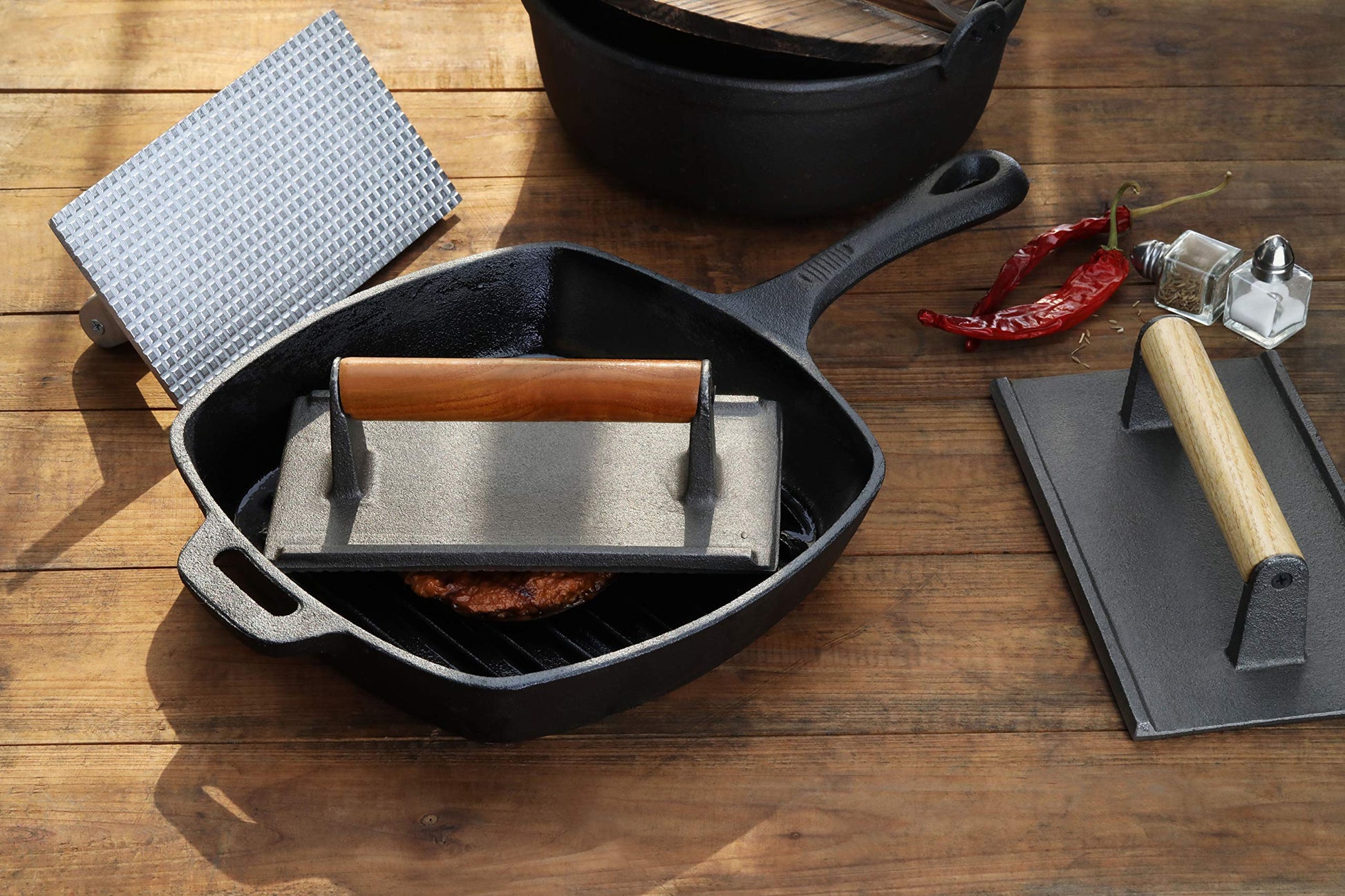 Details: Making sure that food cooks evenly is very important in every kitchen. Ensure that your meats cook evenly by purchasing one of our steak weights. Not only will the food cook faster and more evenly, it will also allow for healthier cooking by squeezing extraneous fat from meat as it cooks. Made from cast aluminum, the heat transfer process will initiate immediately, while the wooden handle will keep your hands cool during use.