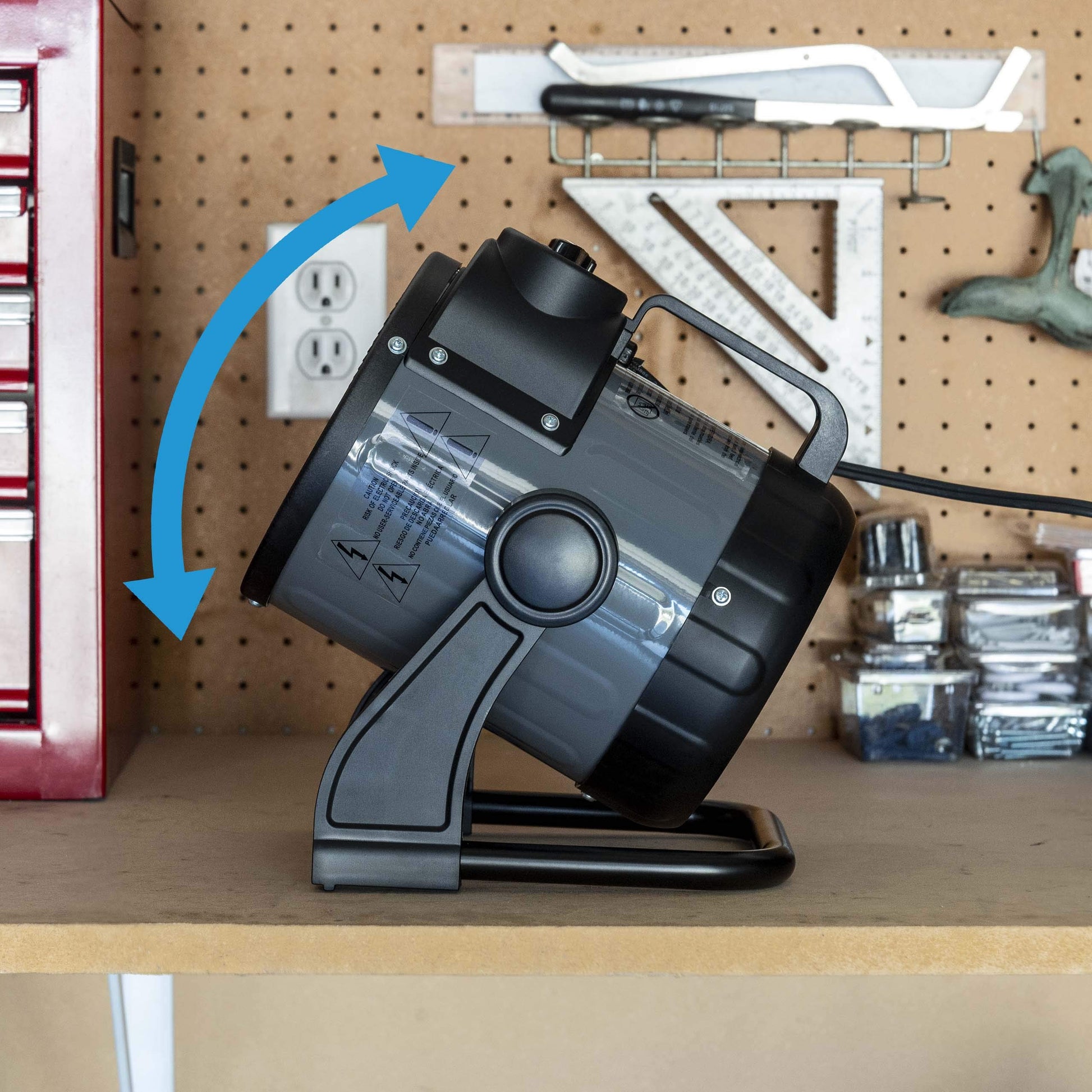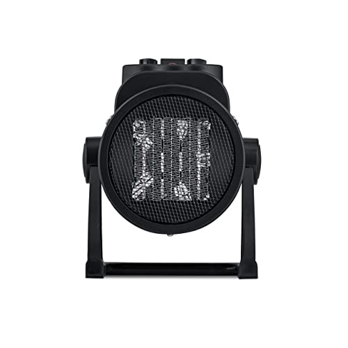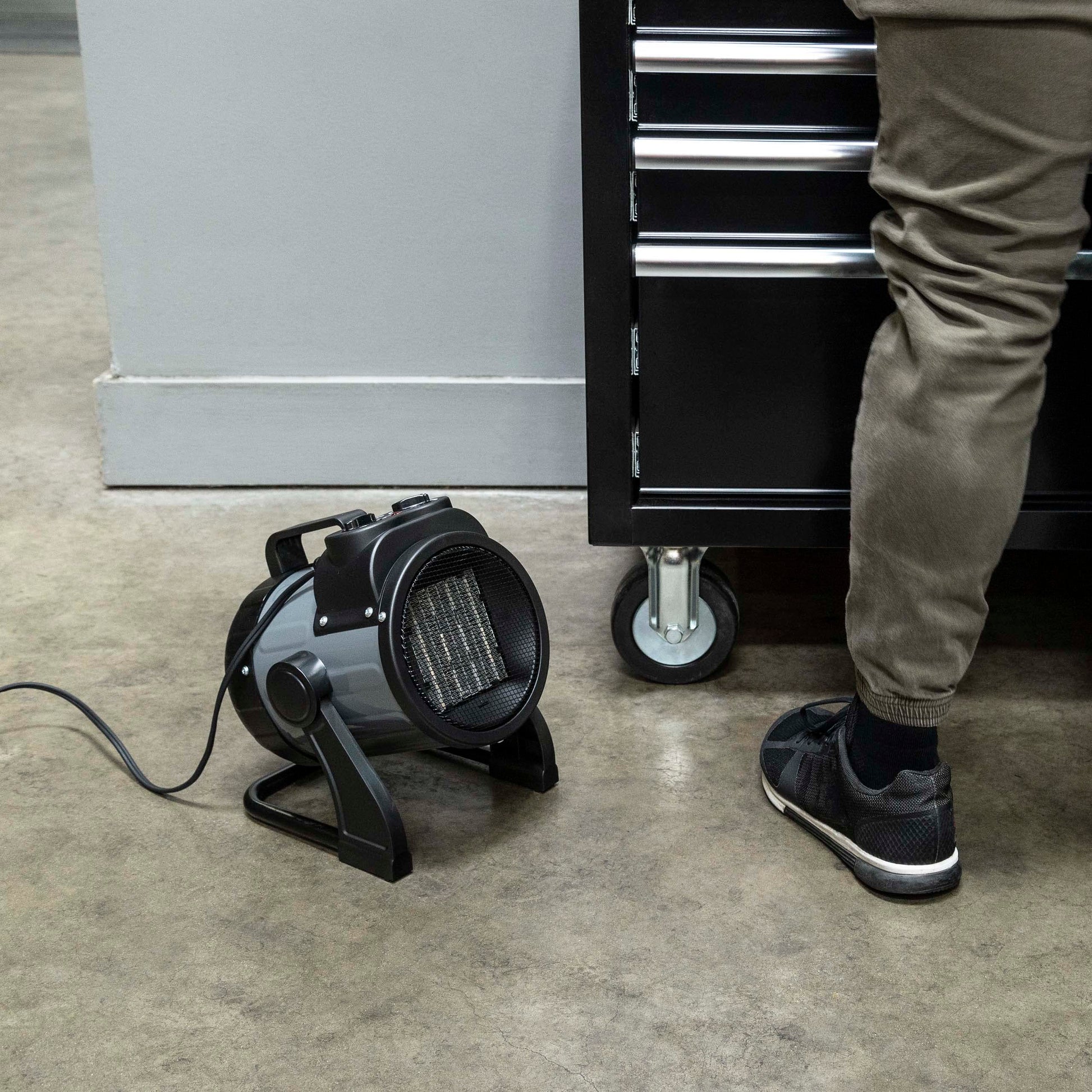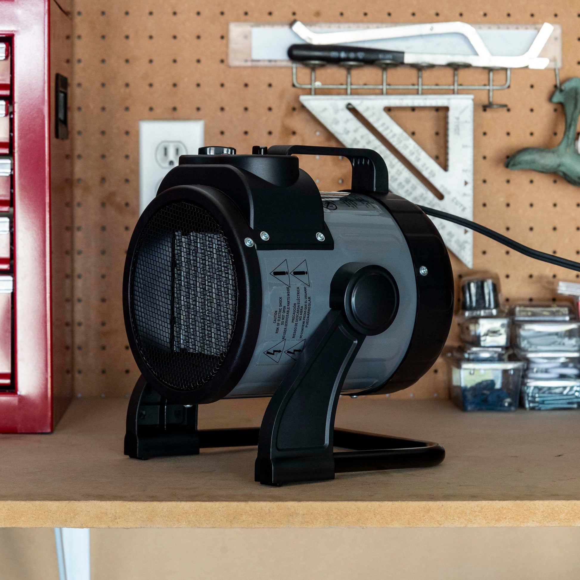 Details: This portable ceramic heater is the ideal companion for working in a garage or workshop on chilly days. It heats up fast and gets to work right away, delivering warm air to your workspace without any wait time. You'll stay toasty, too. Tilt your heater head and adjust the airflow in any direction up to heat up to 160 square feet of space from where you sit. Plus, this portable heater is easy to store when not in use and is designed to stand up to rough-and-ready working conditions. The 120-volt plug works in any standard outlet for total flexibility on the go, Heavy-duty construction ideal for garages, workshops and more, Portable, lightweight design and 120v plug for extra heat anywhere, ceramic heating plate paired with a 200 CFMs fan heats up to 160 square feet of space, Adjustable, tilt head aims heat where it's most needed for spot heating,