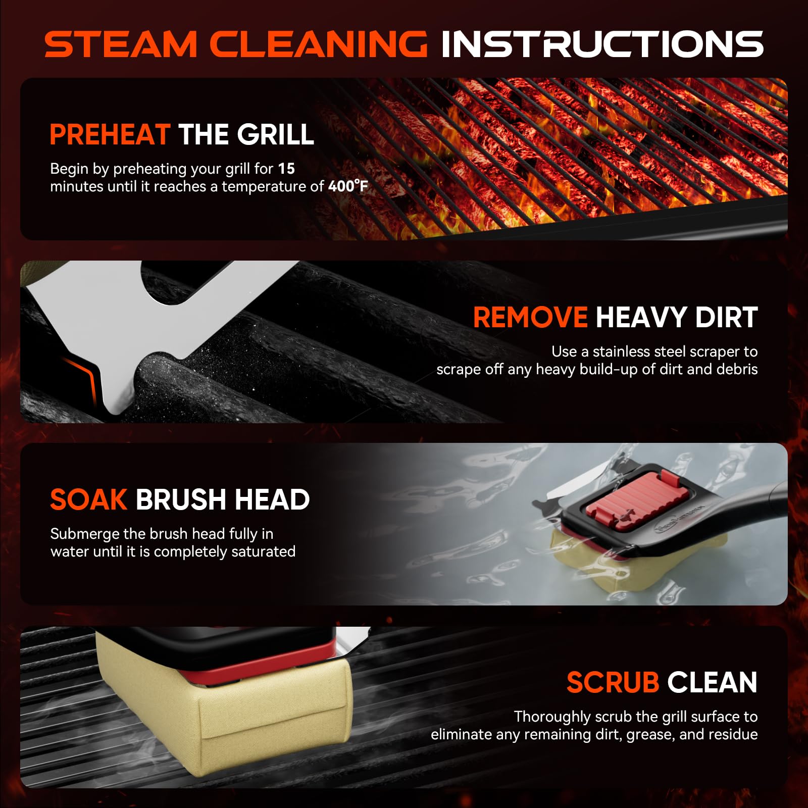 • EASY TO USE: Simply heat the grill to 400°F, use the stainless steel scraper on the brush head to scrape stubborn grease from the grill, soak the brush head in water, and then clean the grill with the power of steam to melt grease and stains instantly!