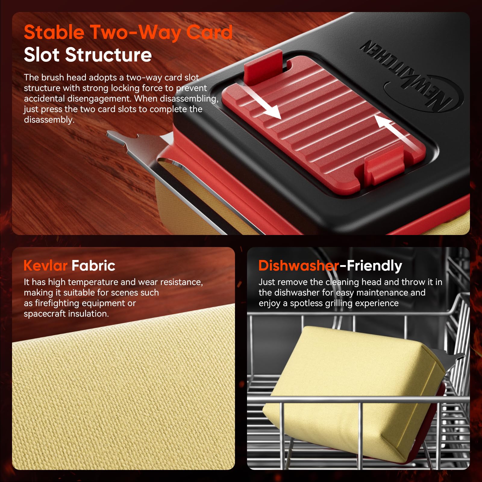 • KEVLAR FIBER: The grill cleaner brush head fabric is made of high-quality Kevlar for excellent abrasion resistance and superb heat resistance. It can consistently withstand a residual temperature of 600°F, ensuring efficient and thorough cleaning every time!