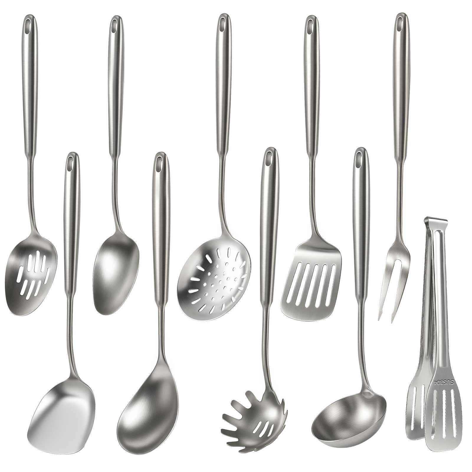 Newness 10 Pcs Cooking Utensils Set, 304 Stainless Steel Kitchen Utensils Set, Metal Kitchen Accessories, Include Soup Ladle, Slotted Skimmer Spoon, Spaghetti Spoon and Spatula, Tongs,Dishwasher Safe