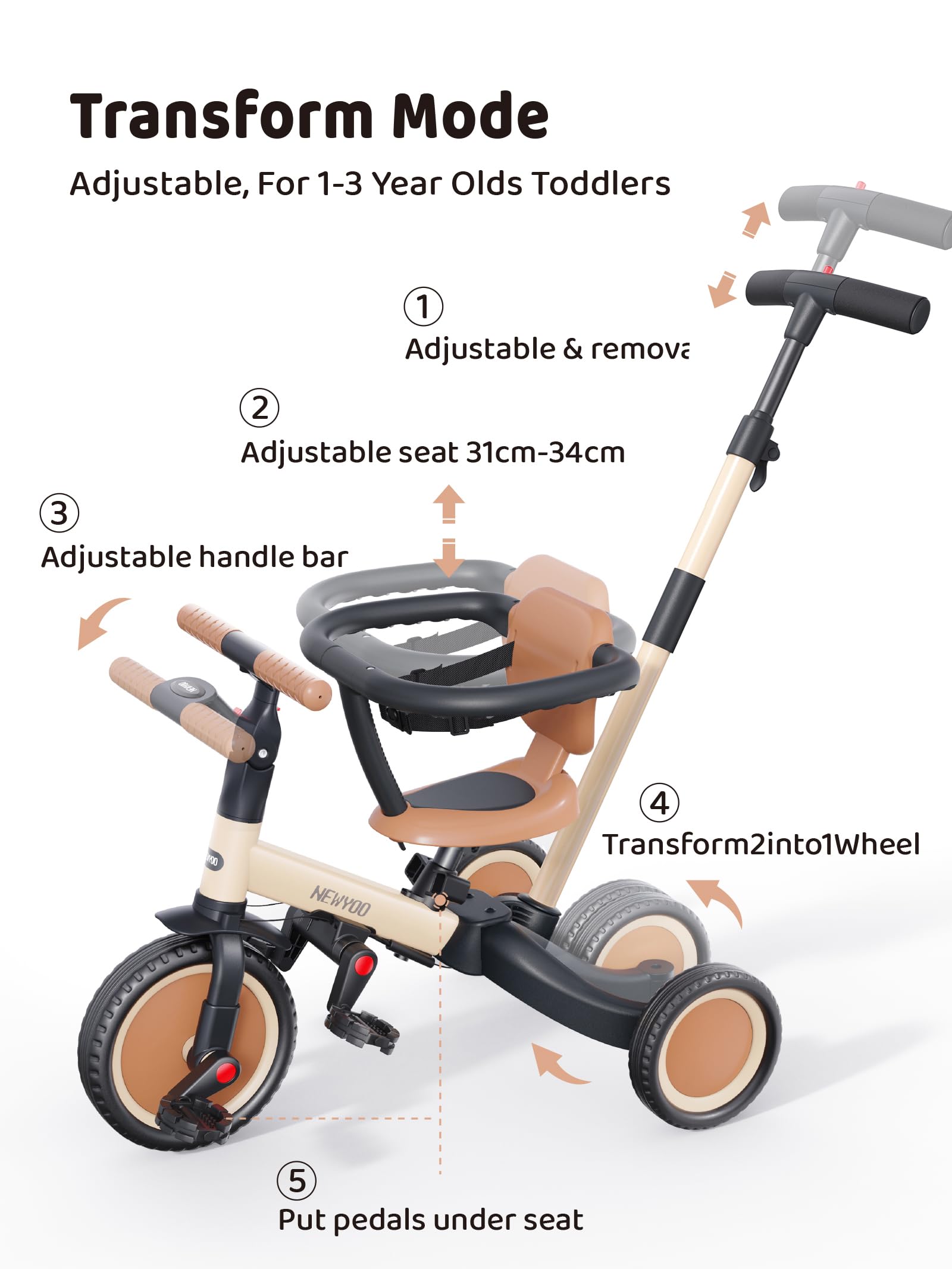 newyoo TR008 5 in 1 Toddler Tricycle with Push Handle for 1-3 Year Old Boys and Girls, Kids Push Trike with Safe Bar, Toddler Bike, Convert to Balance Bike, Birthday Gifts and Toys for Baby, Cream