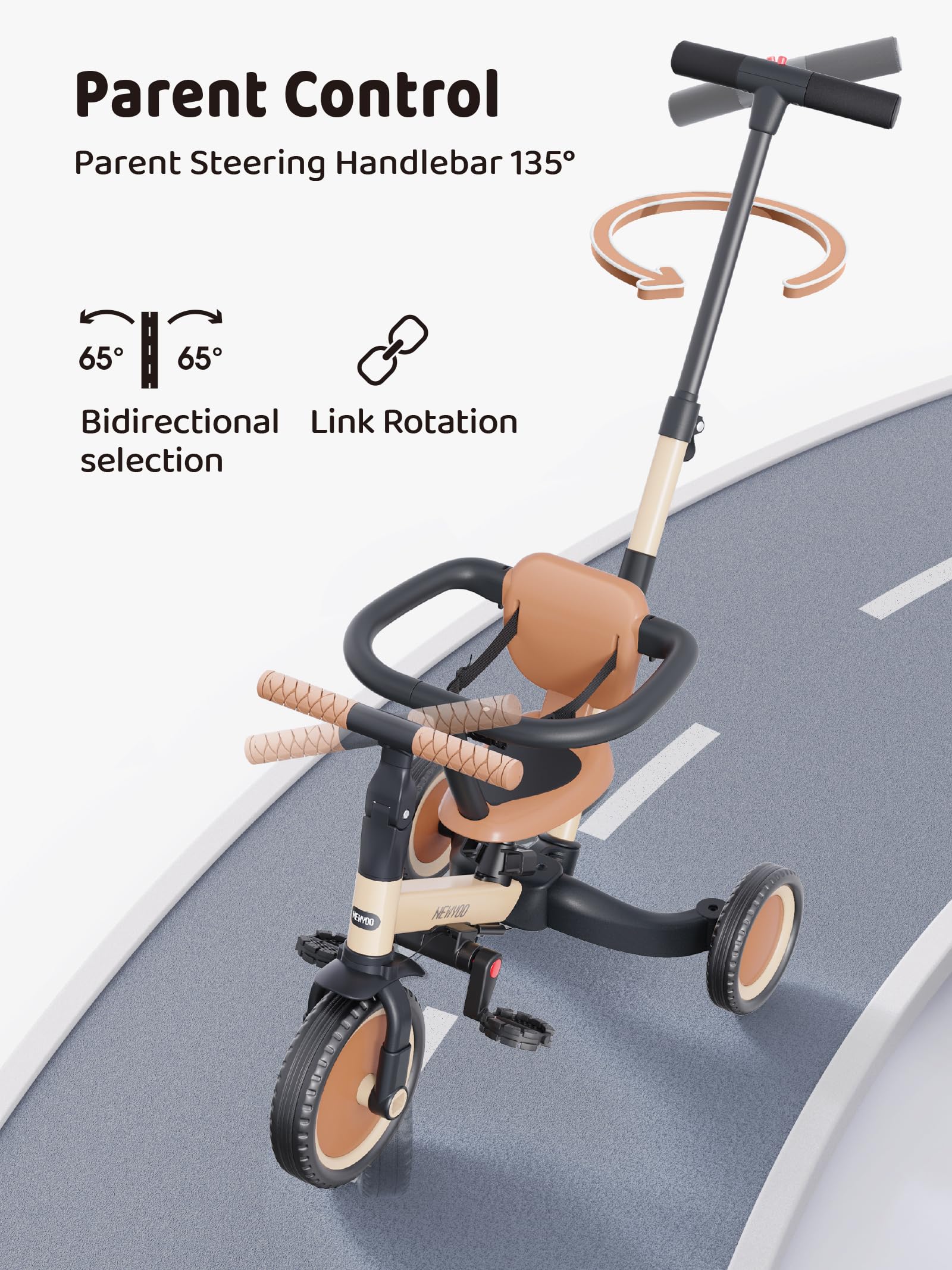 • Steering Push Handlebar: Rotating 135 degrees to control and steer the speed and direction of tricycle. Protecting your child from falling down and injuring. It also can be adjusted according parents’ height so that dad and mom can accompanied to practice with your little.