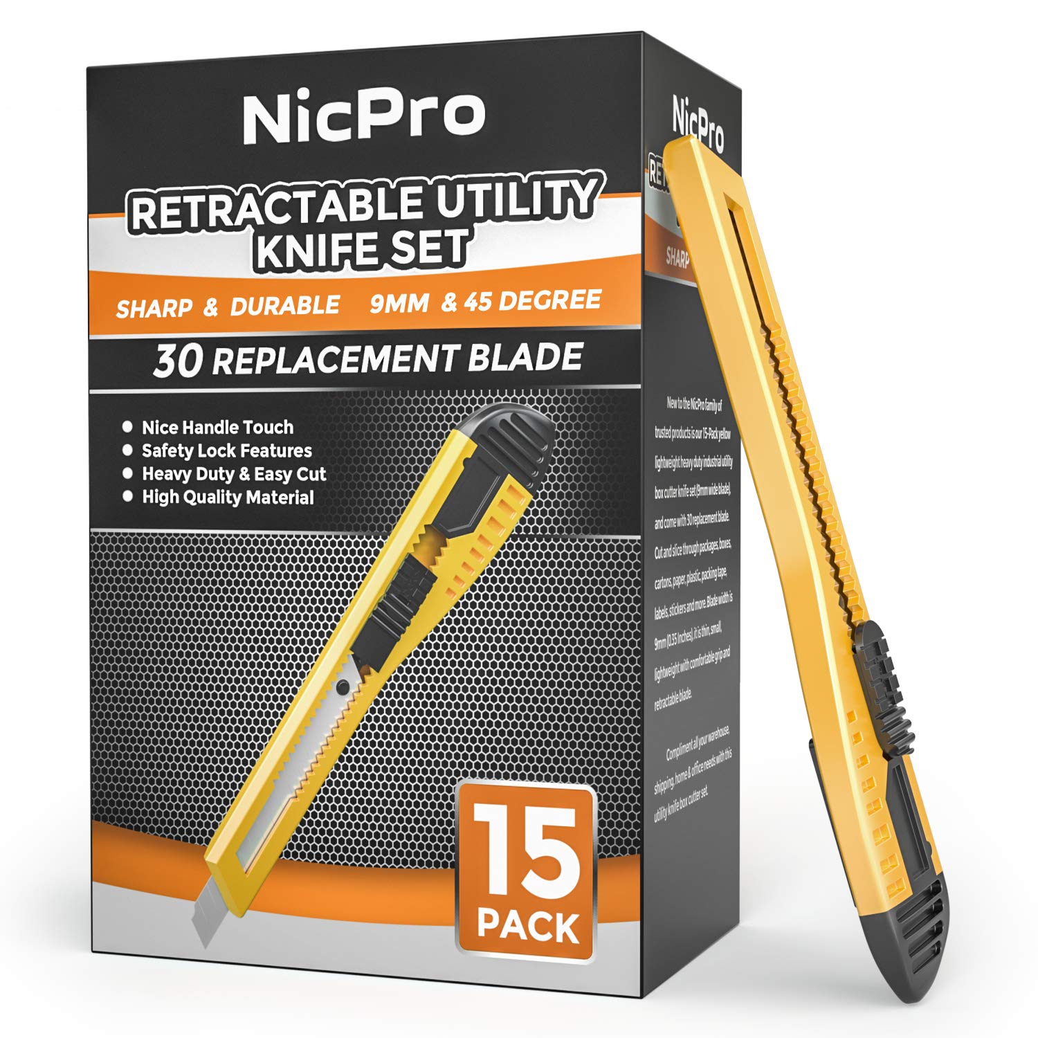 Nicpro 15 PCS Utility Knife Box Cutters Retractable Razor Knife 9mm with 30 PCS Extra Snap Off Blades for Lightweight Office, Home, Arts Crafts, Hobby