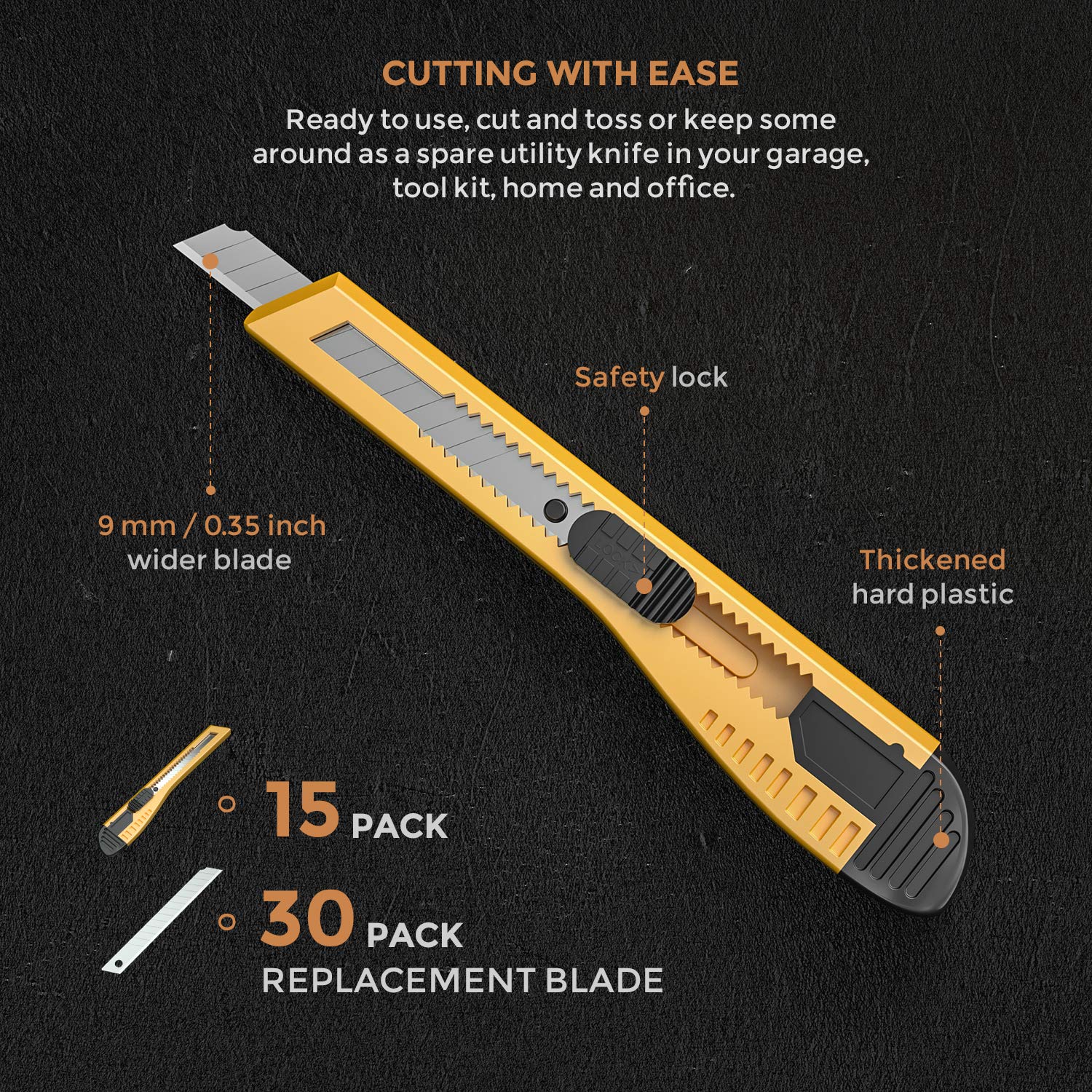 • 1.Pack of 15 retractable razor-sharp utility knife and 30pcs blades replacement