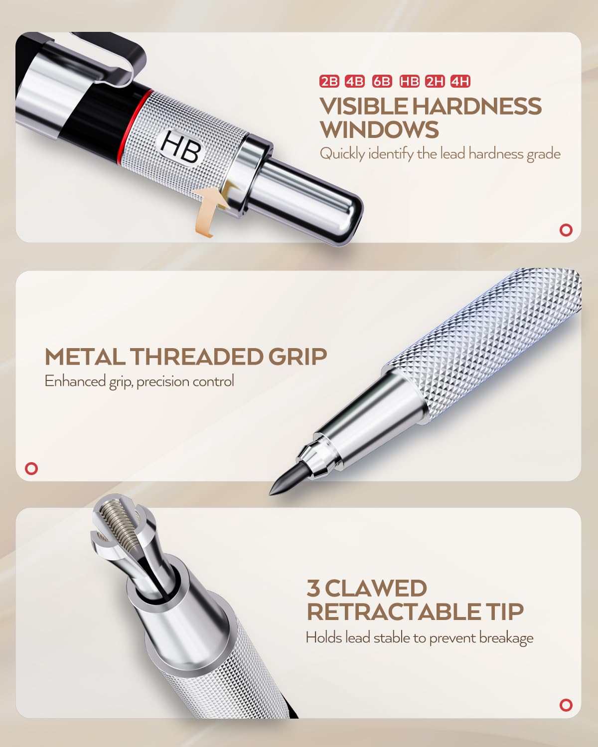 • Ergonomic, Comfortable Design :The full-metal body provides ideal weight balance for fatigue-free writing and drawing or sketching, It brings you more effective and high quality tasks. The lead advances easily at the touch of a click. There is a sharpener in the cap of 2.0 mm mechanical pencil.
