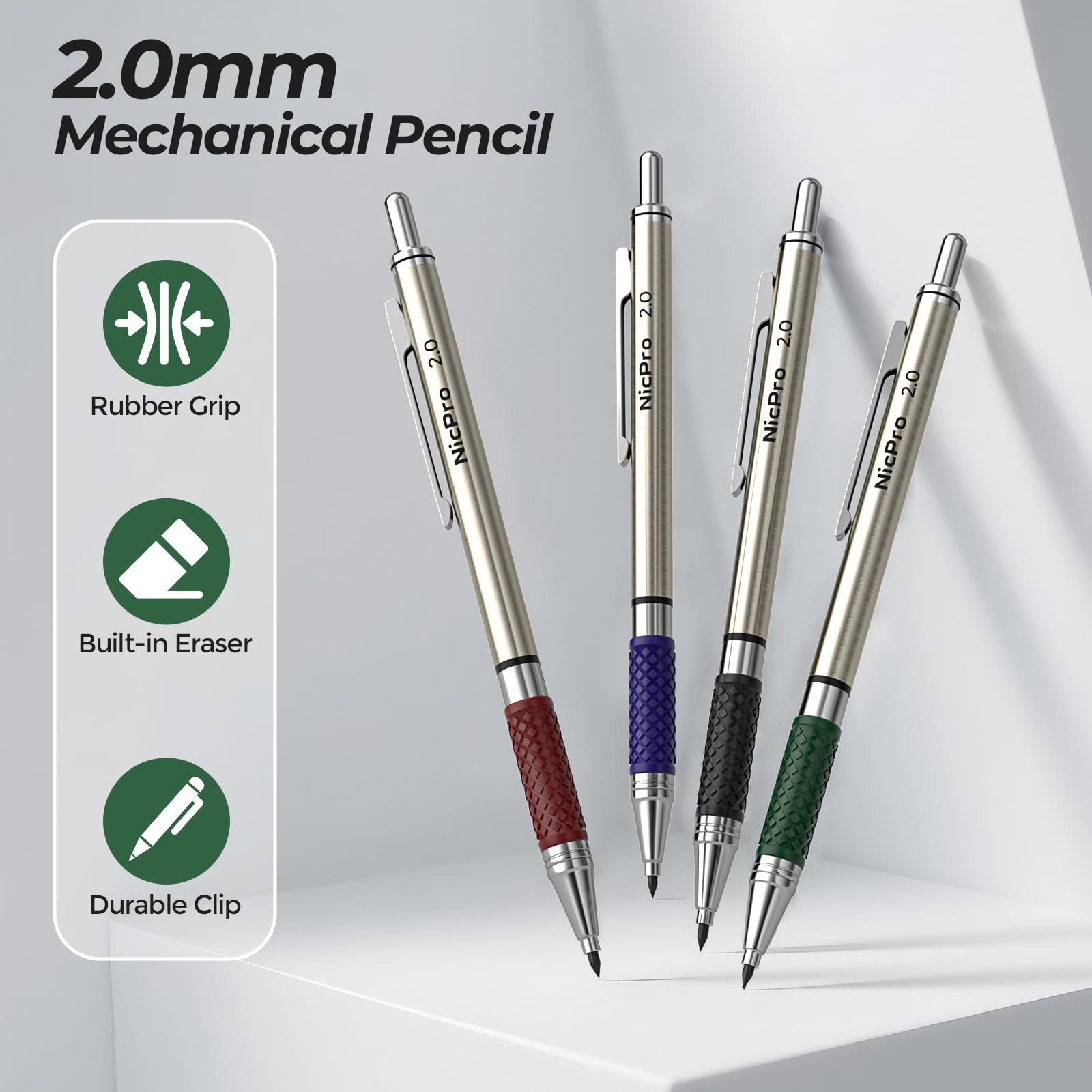 • Comprehensive Stationery Set: Nicpro mechanical pencil set that includes 4 pcs mechanical pencils 2.0, 108 pcs 2mm lead refills(HB, 2B black and color), erasers and 2 pcs sharpeners. It offers everything you need for various writing and drawing tasks, making it a one-stop solution for all your stationary needs