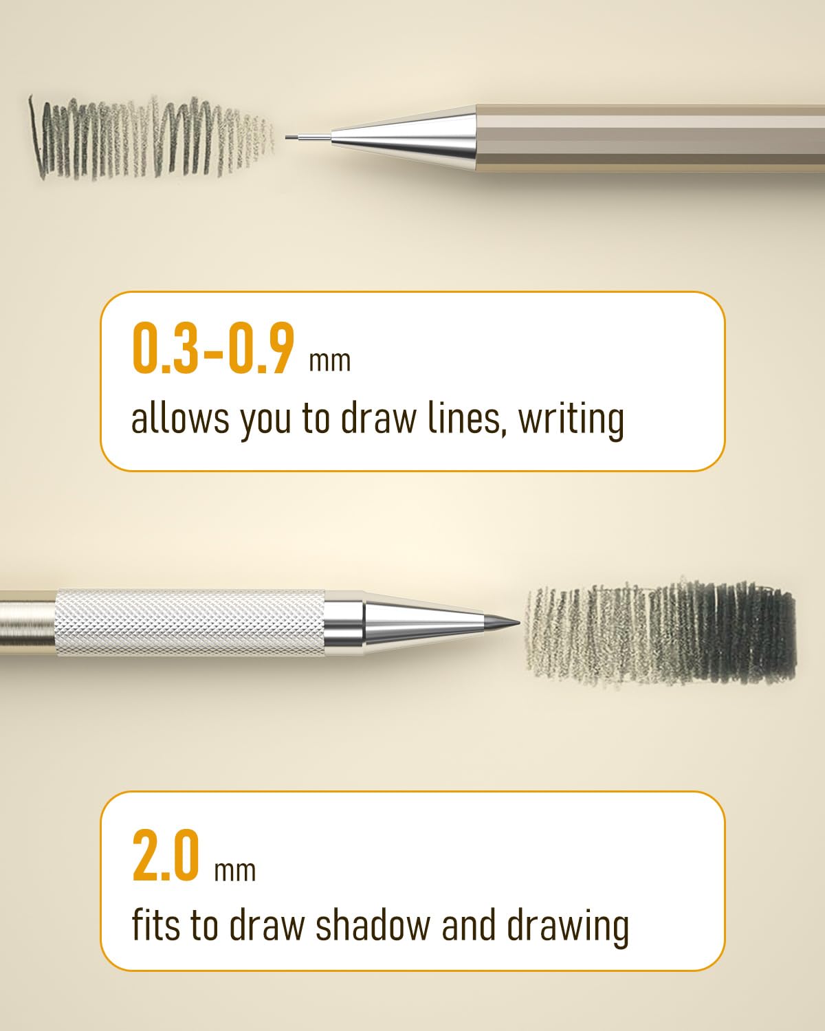 • 【4 PCS Mechanical Pencils】: 4 mm tip length makes it ideal for use with rulers and templates, various line size (0.3 mm,0.5 mm,0.7 mm & 0.9 mm) satisfy your demand. Polygon shape of these mechanical writing pencils avoids sliding on drawing tables. In addition, the pencil is pre-loaded with a 90mm-lead. (with each 60pcs extra lead refill for 0.3, 0.5, 0.7, and 40pcs 0.9 pencil lead refill.)