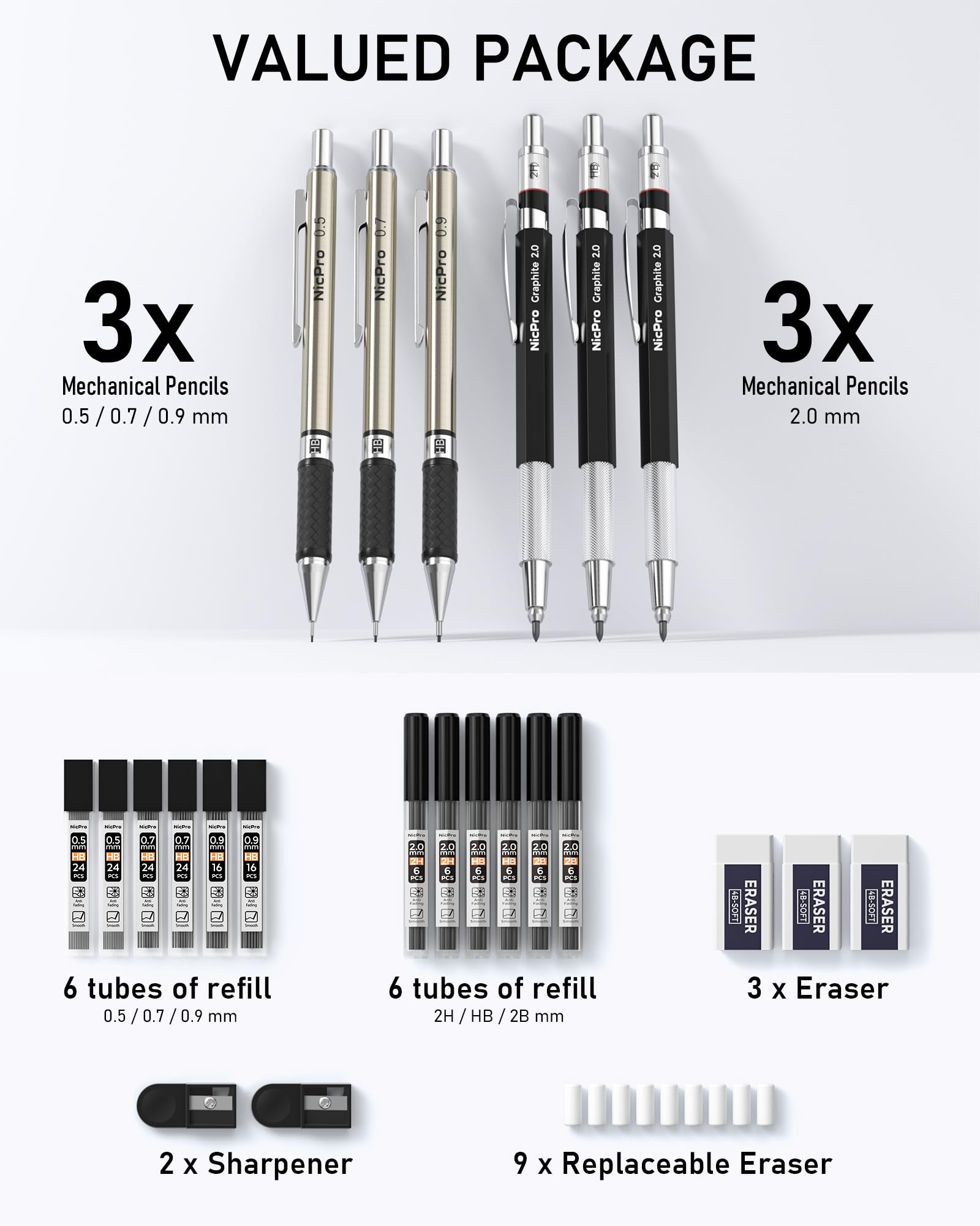 • Value Package :Come With 6 PCS mechanical drafting pencils ,including 0.5 mm & 0.7mm & 0.9mm and 2mm ,12 tubes of refill : 0.5mm & 0.7 mm & 0.9mm ,2.0 mm (2B HB 2H) , 3 PCS of erasers , 9PCS of cap eraser refills, 2 PCS sharpener and a mechanical pencil case