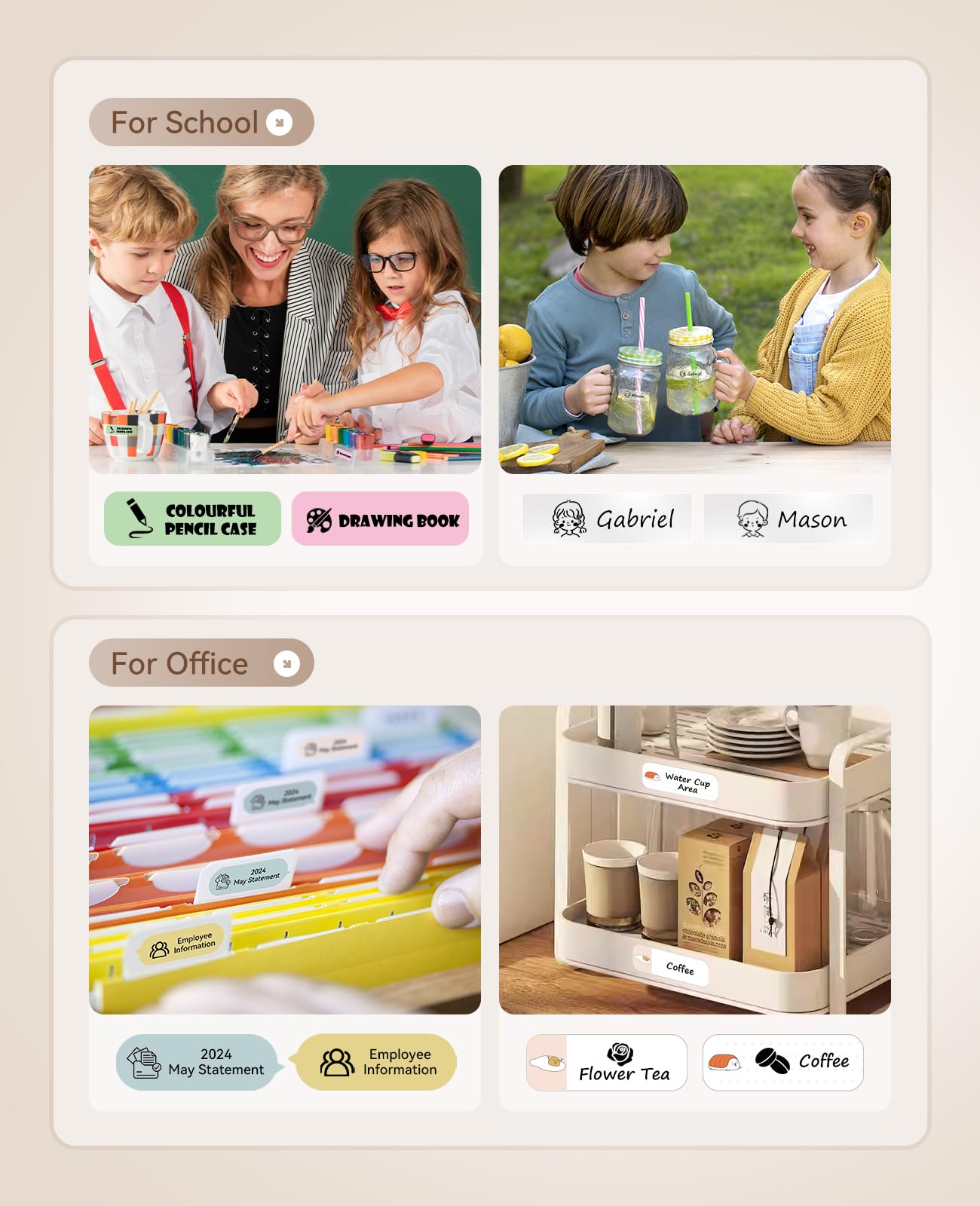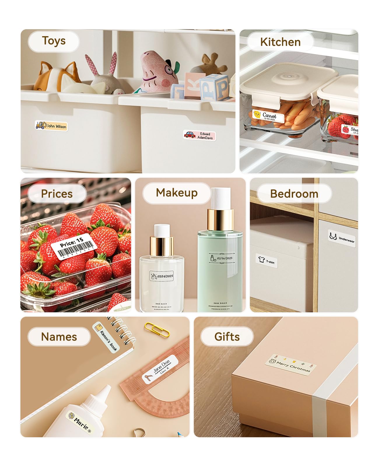 • 【2025 New Version Label Maker】This household organization label maker is the 2024 new version D110 label machine, smaller but better, offering superior print clarity resulting, smooth printing effects and fast processing. Easy to use for quick home use and basic label making, which also can help labeling in school, perfect for back to school gifts.
