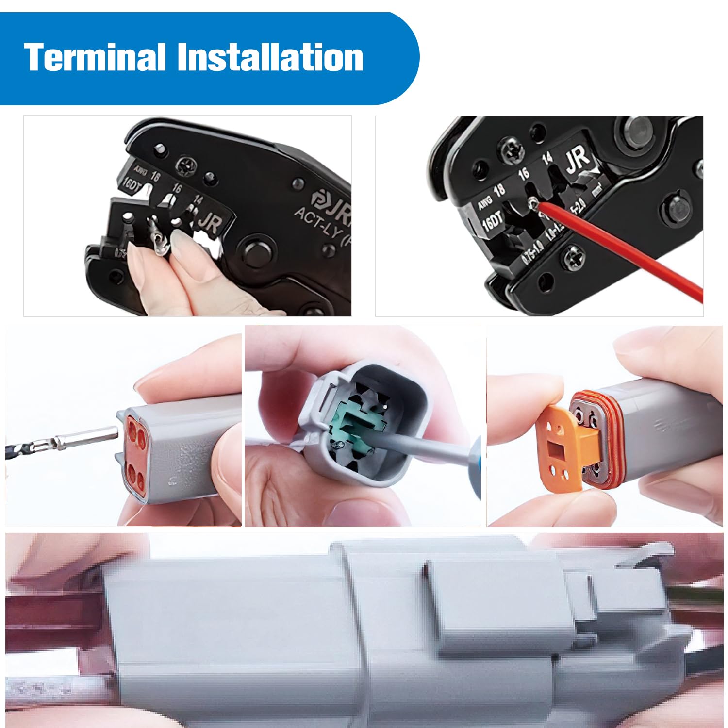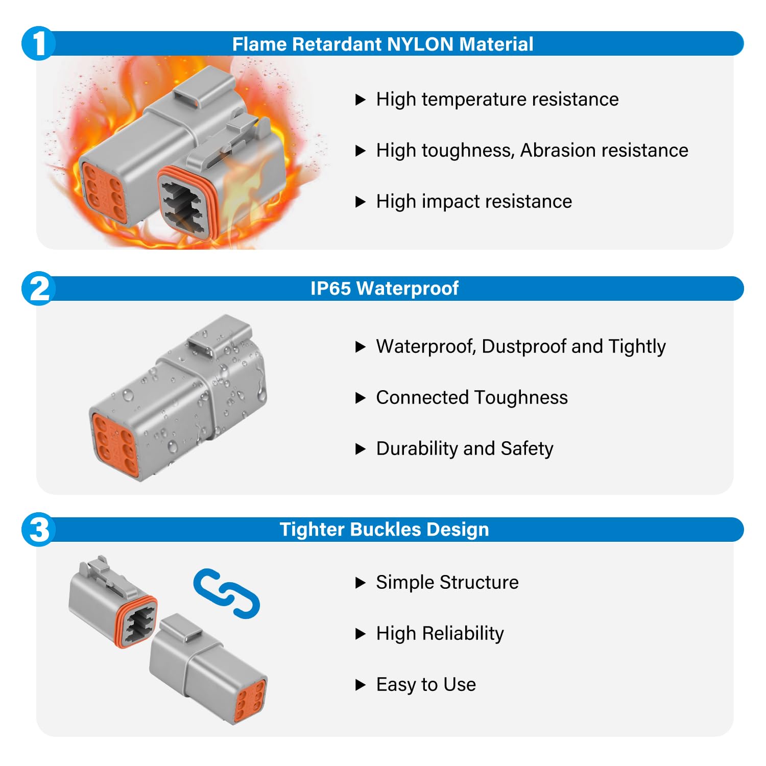 • DT Connectors: our DT electrical wire connectors are resistant to dust, dirt, moisture, salt spray, vibration, contamination, with 100% environmental sealing and highly reliable pin contact that helps eliminate wiring problems. will not lose electronic qualities or leak after installation. Optional in-line, flange or PCB mount.