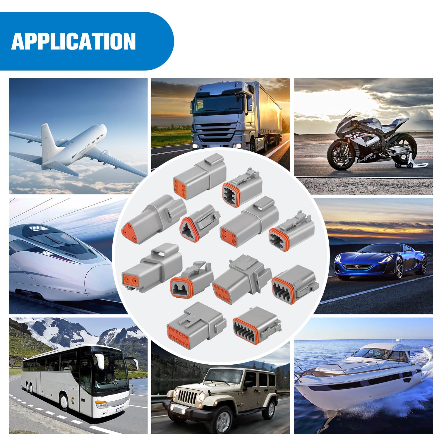 • Wide Application:DT connectors are by far the most popular connectors used in many automotive, industrial and racing applications. Widely used in truck, car, motorcycle, boat maintenance and DIY projects and other fields.