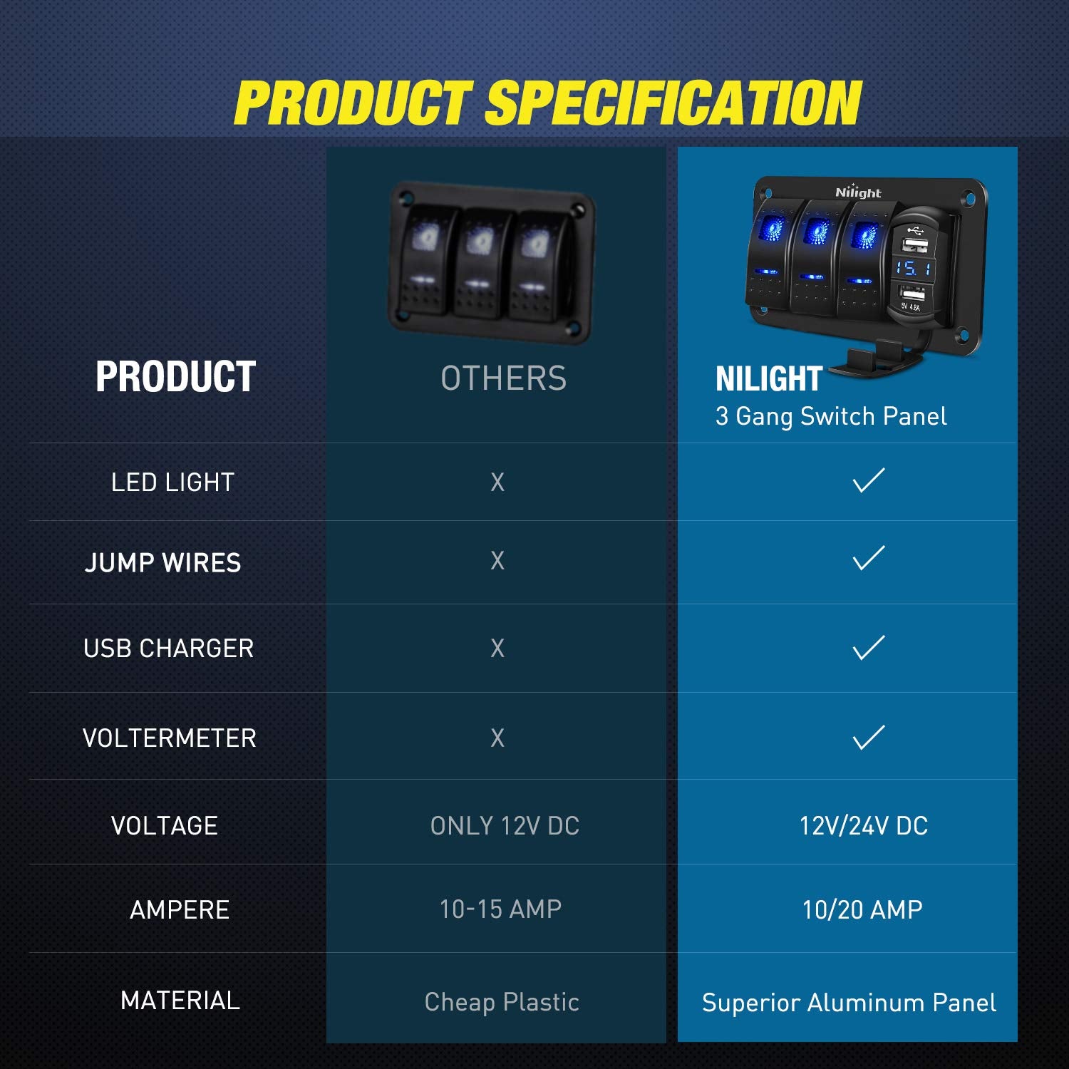 Details: Nilight 3 Gang Rocker Switch Panel Red Backlit with 4.8 Amp Dual USB Charger Voltmeter Waterproof 12V 24V DC Rocker Switch with Night Glow Stickers for Cars Trucks Boats RVs