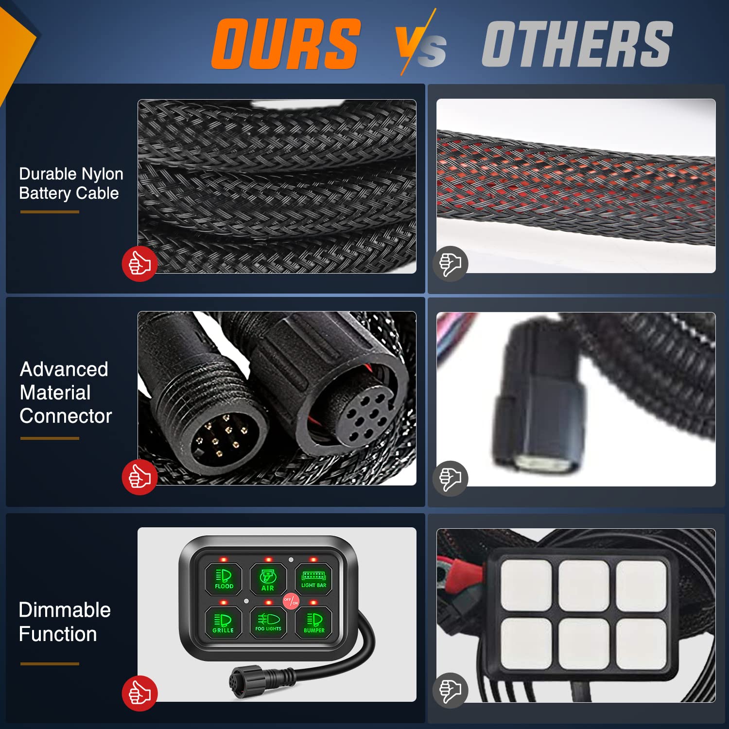 • ALL-IN-ONE Design: The 6 gang button switch pod is integrated with circuit control relay system,Fuses,Wiring harness,extension cable, 50pcs reusable stickers and 2 sets of switch panel mounting options.Which is designed to work together with better performance. No needs to buy other parts.
