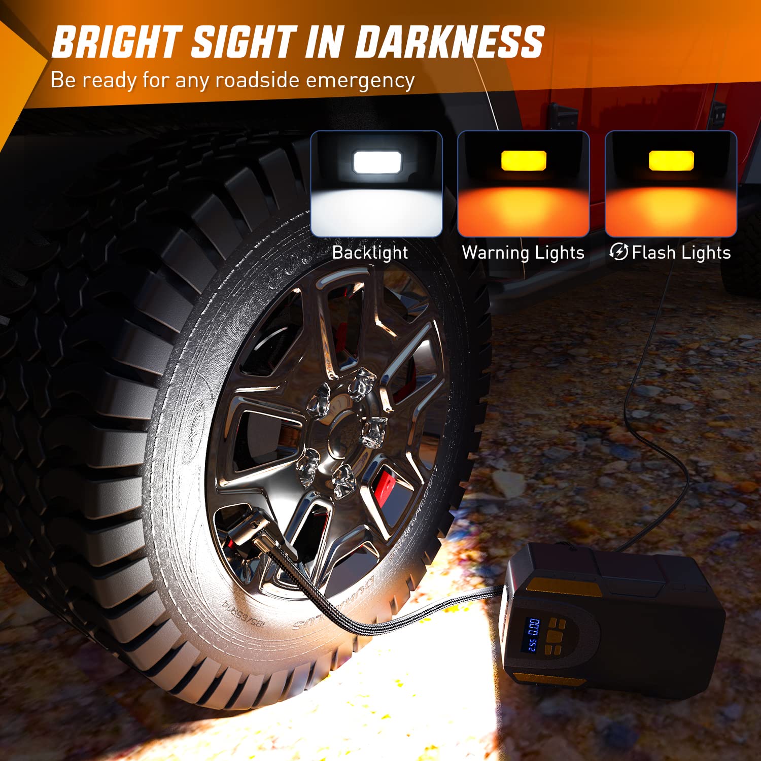 • Digital Display & LED Lighting: 4 pressure measurement units of PSI, KPA, BAR, KG/CM2. The tire pressure will be displayed on the screen of the air pump so that the pressure can be better controlled when inflating tires to ensure safety. Furthermore, the air pump comes with a LED lighting feature includes backup light, warning light and flash light modes to support your inflating needs in dark environment.