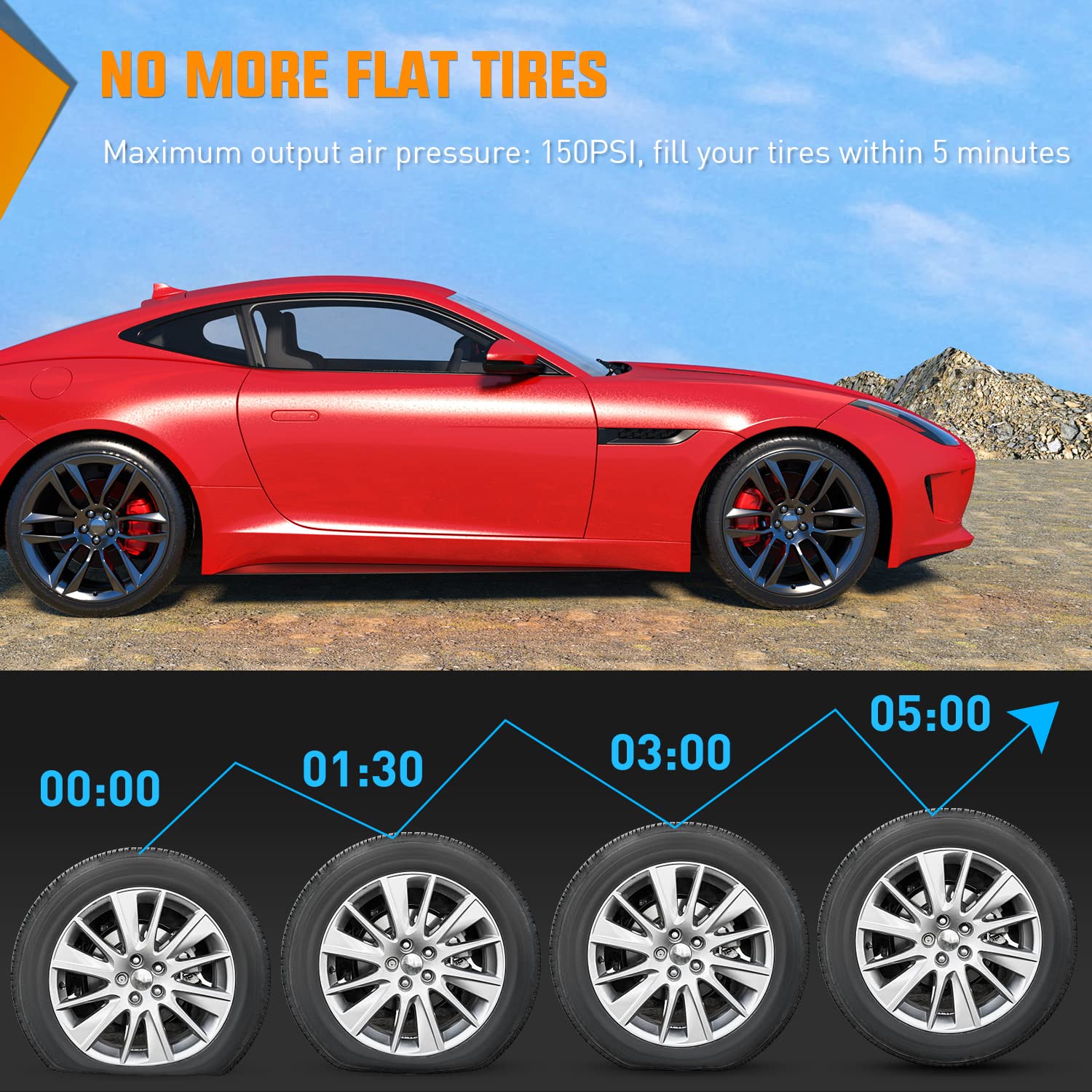 • No More Flat Tires: Nilight Tire Pump can inflate the 195/55/R15 car tires from 0 to 35psi within 5 minutes and capable of providing a maximum pressure of 150 psi and an airflow of 35L/Min. Professionally inflate your flat tires and much more effective and faster than traditional tire pump. A great solution for emergency on the way.
