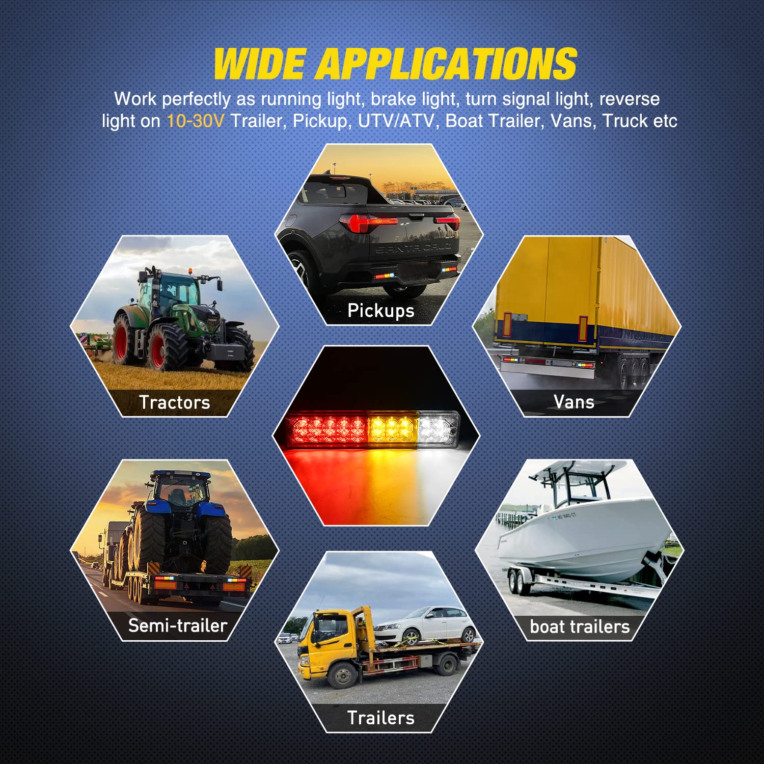 • Outstanding brightness: Each light is composed of 20pcs high-quality and durable LED, stably output super bright red running/brake light, white reverse light and amber turn signals light. The rear vehicles can clearly see your light changes during the day and night, ensure your travel safety.