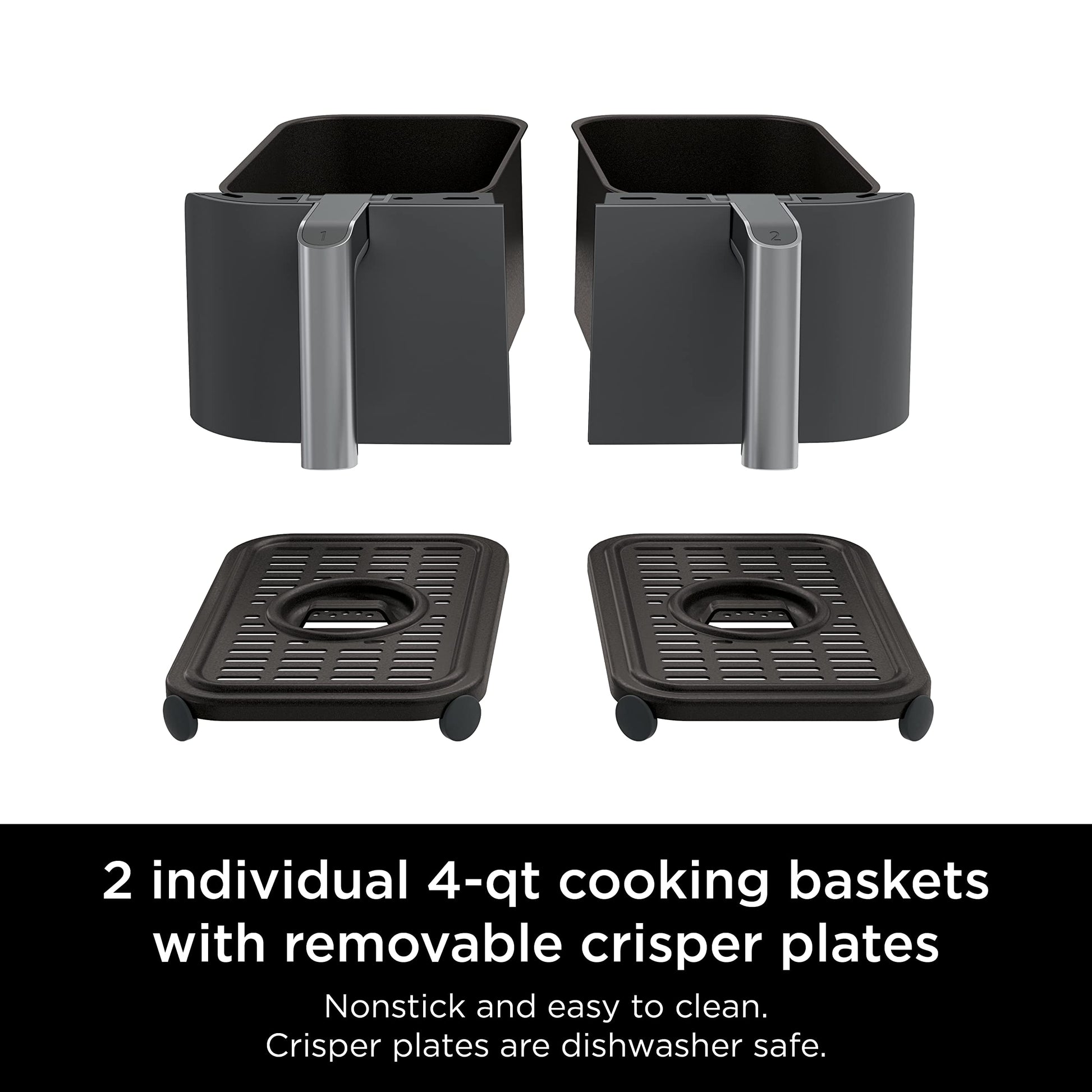 • WHAT'S INCLUDED: DualZone Air Fryer, (2) 4 Quart Baskets, (2) Nonstick Crisper Plates, 15 Recipes, Additional Meal Options & Cooking Charts.