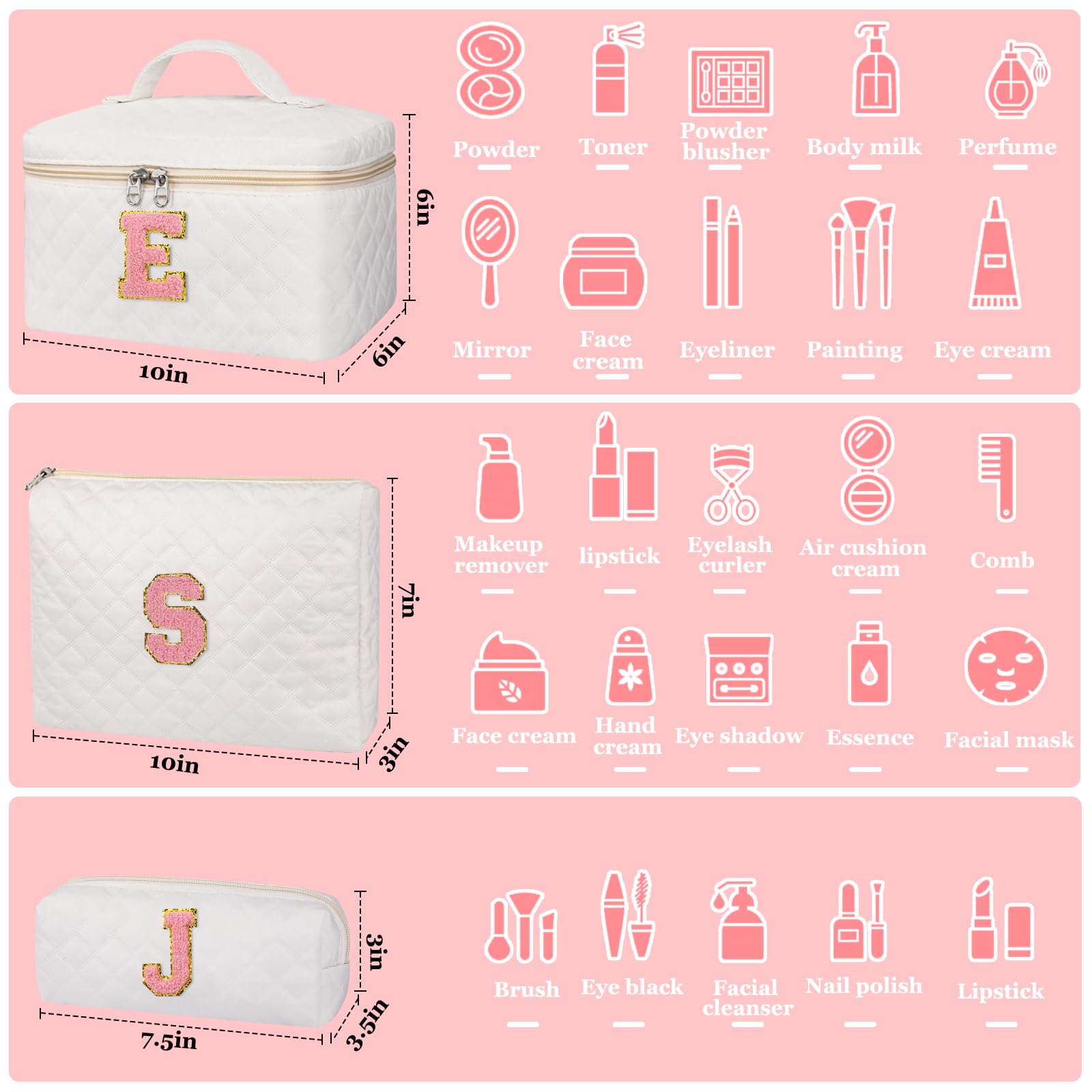 • ✅【Unique Fashion Design】:You will get 3 pack cotton makeup bag in total, the Large initial makeup bag is designed with with a top compartment, which can keep your cosmetics orderly and tidy. The front of the bag has a unique stitch chenille letter will not easy to drop. Suitable for your daily make-up and tools. Our makeup bag is not only a makeup pouch but also but also a storage bag. Ideal for travel, vacation, camping, bathroom organization and outdoor activity.