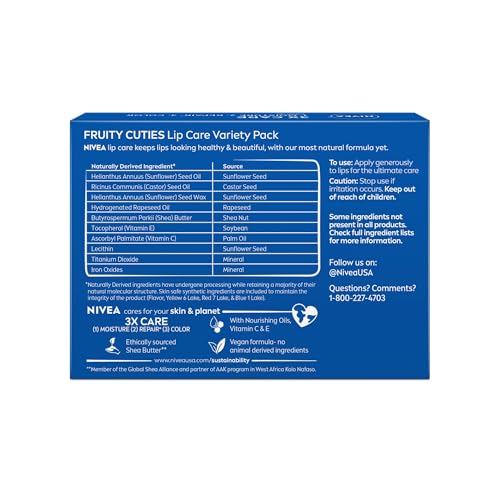Details: This NIVEA Lip Care Fruit Lip Balm Variety Pack includes four delicious fresh fruit flavors that provide lips with long-lasting moisture and a touch of color. This hydrating lip balm pack includes cherry, strawberry, blackberry and watermelon. These tinted lip balms are enriched with ethically sourced Shea Butter(1), Nourishing Oils, Vitamin C and Vitamin E, and help moisturize and repair dry lips. Each flavored lip balm leaves lips with a beautiful tint and subtle shine. NIVEA Lip Care colored lip balms care for your lips and the planet with a vegan formula made with no animal-derived ingredients and 98% naturally derived ingredients.(2) Keep a lip balm stick in your desk, pocket, purse or car for healthy-looking, soft lips at a moment's notice. From the World's No. 1 Lip Care Company.(3) (1) Member of the Global Shea Alliance and Partner of AAK program in West Africa Kolo Nafaso. (2) Naturally Derived Ingredients have undergone processing while retaining a majority of their natural molecular structure. 2% skin safe synthetic ingredients are included to maintain the integrity of the product (Flavor, Yellow 6 Lake, Red 7 Lake, Blue 1 Lake). (3) Euromonitor International Limited, Beauty and Personal Care 2024 edition, Beiersdorf AG, retail value RSP, 2023 data.