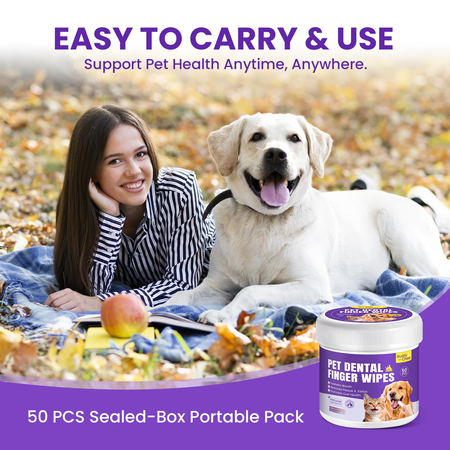 No-Rinse Dog Dental Care Wipes, Cat & Dog tooth brushing kit, Dog Wipes for Pet & Cat Teeth Cleaning, Dog toothbrush Finger Dental Wipes to Remove Plaque & Tartar, Disposable Dog Wipes - 50 Count