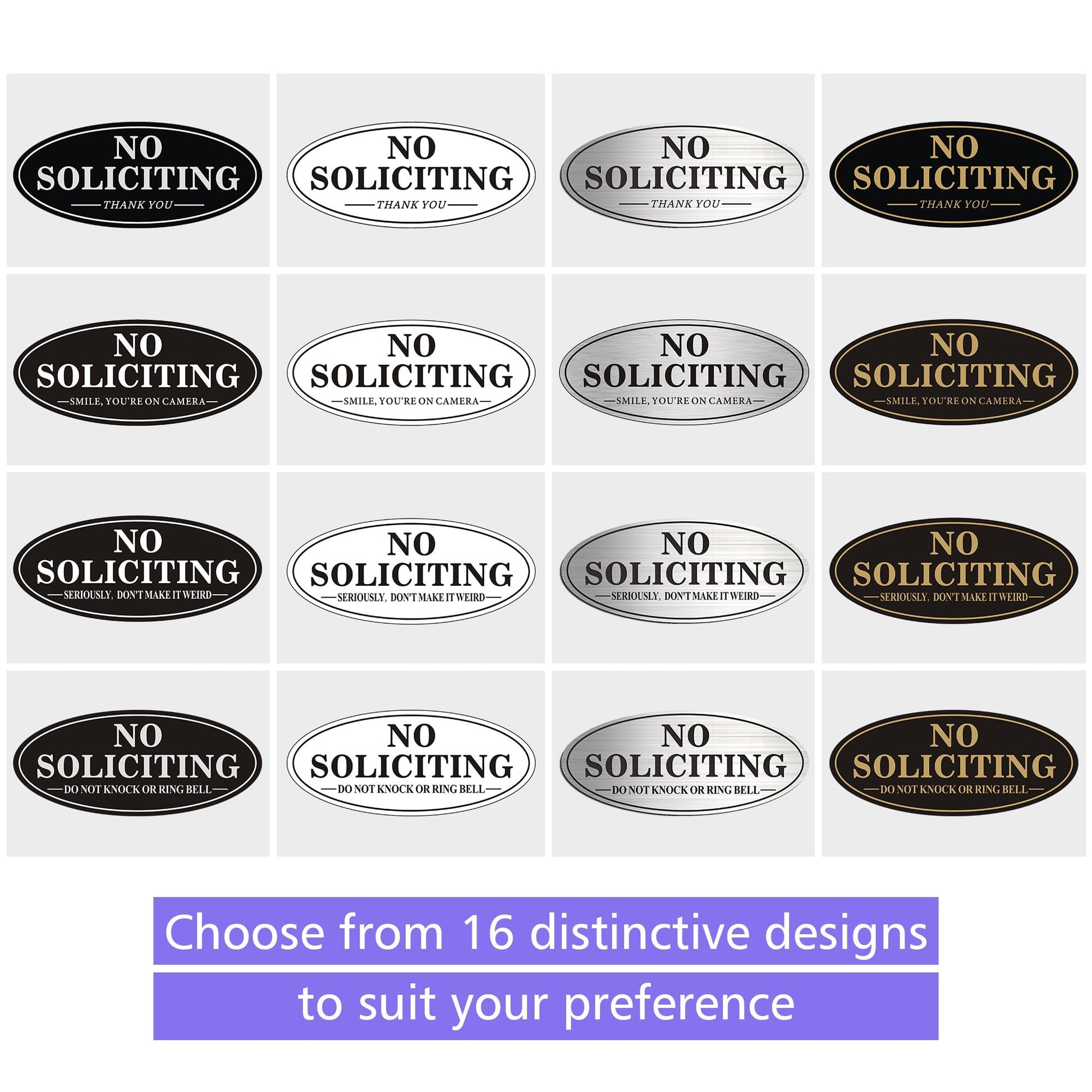 • 7. VARIETY OF UNIQUE DESIGNS: Discover a wide range of designs and colors available for our oval No Soliciting Sign for Front Door. Visit our store or search for MongFun on Amazon to find a diverse selection of similar metal signs. We offer signs with stakes, self-adhesive backing, as well as small and large sizes for various use.