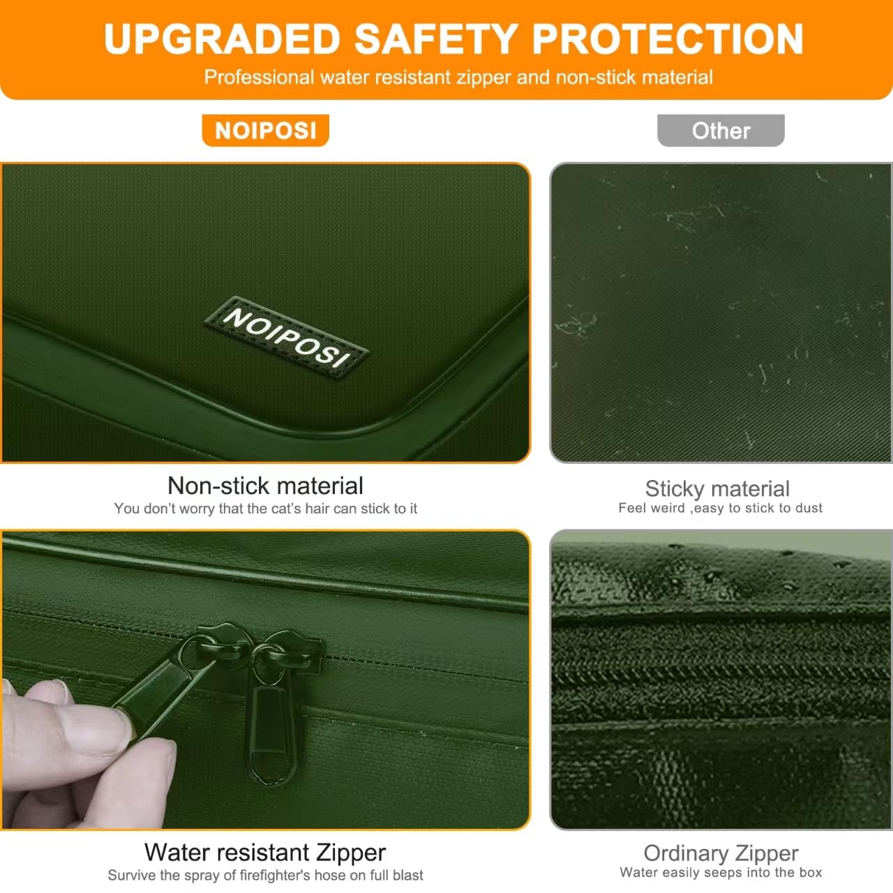 • New Non-stick Material and Waterproof Zipper: through the unremitting efforts of technicians, now they have developed a non-sticky anti-static material for lock box for documents .We don’t worry that the cat’s hair and dust or dirt particles would immediately stick to it.Meantime, the Sealed zippers of important document storage are totally waterproof which can survive the spray of firefighter's hose on full blast, provides security seal and maximum protection for our documents