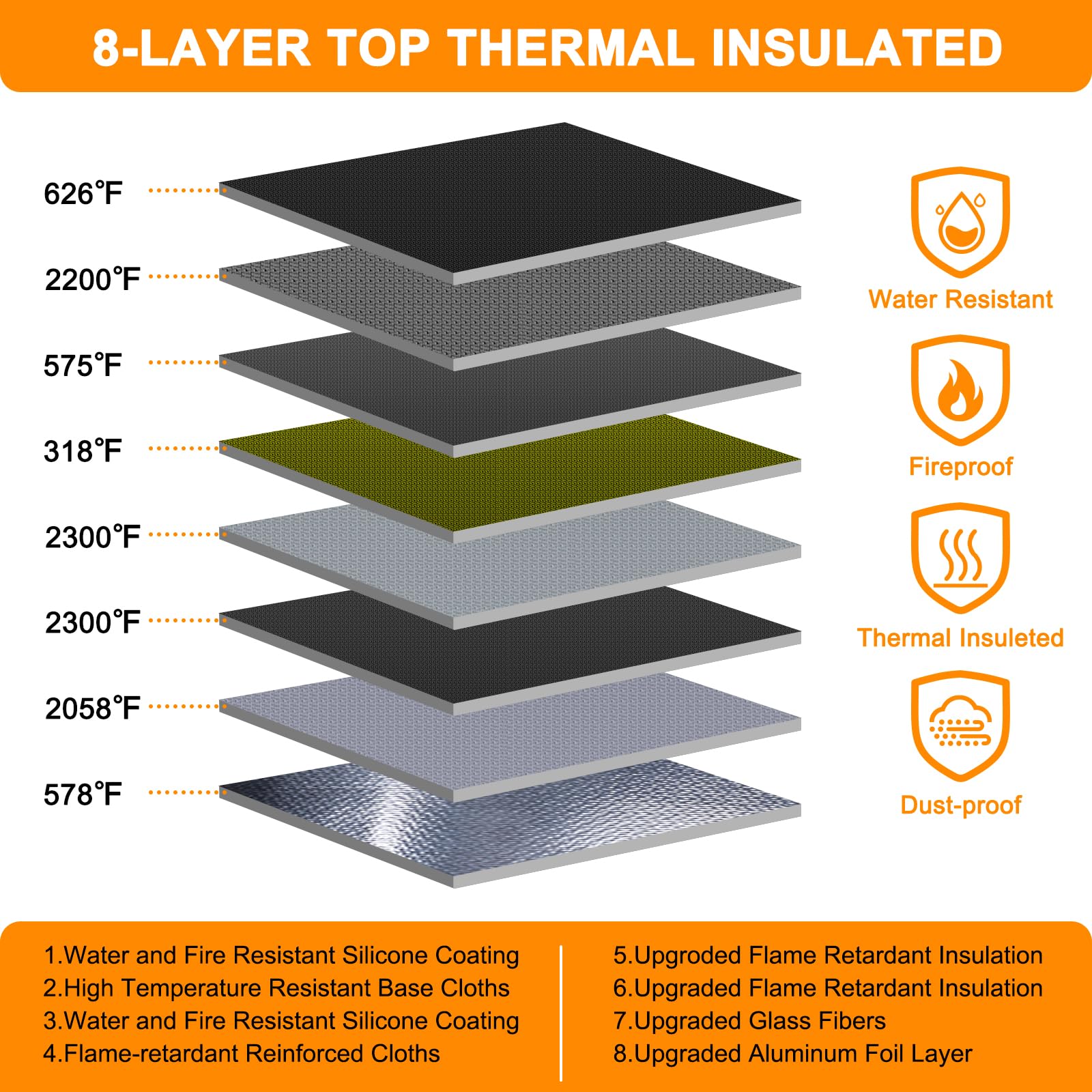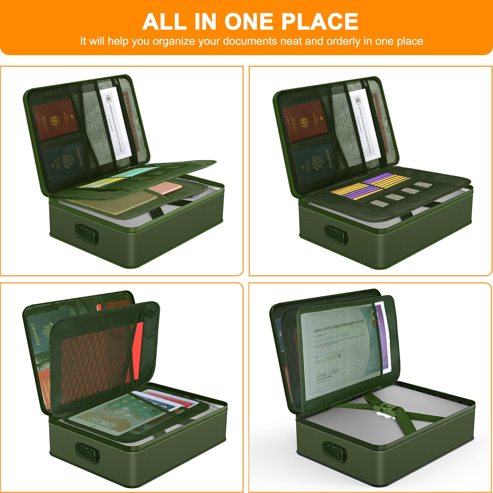 • 5200℉ TOP FIRE PROTECTION::important document organizer is made of silicone fiberglass ,Insulated cotton and Aluminum Foil which withstands high temperature up to 5200℉ .Important document storage adopts a 8-layer function material structure of fire protection and heat insulated to help the heat blocking from your valuables . It will give enough time to save your valuables from fire .Fire box safe for documents is highly recommended by firefighters in the most demanding environments