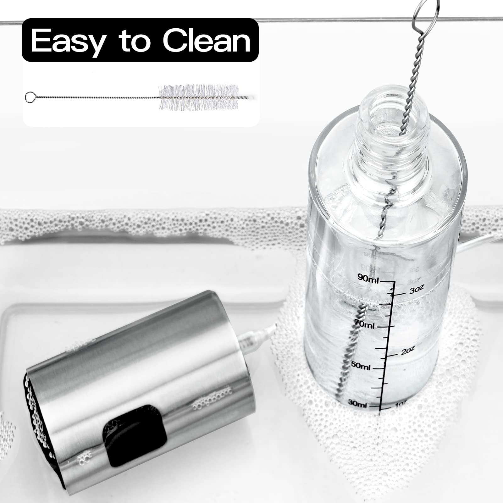 • Food Safe Oil Spray Bottle - Expertly crafted from top quality 304 stainless steel and boasting a BPA free 100ml graduated glass bottle, comes with funnel and cleaning brush.