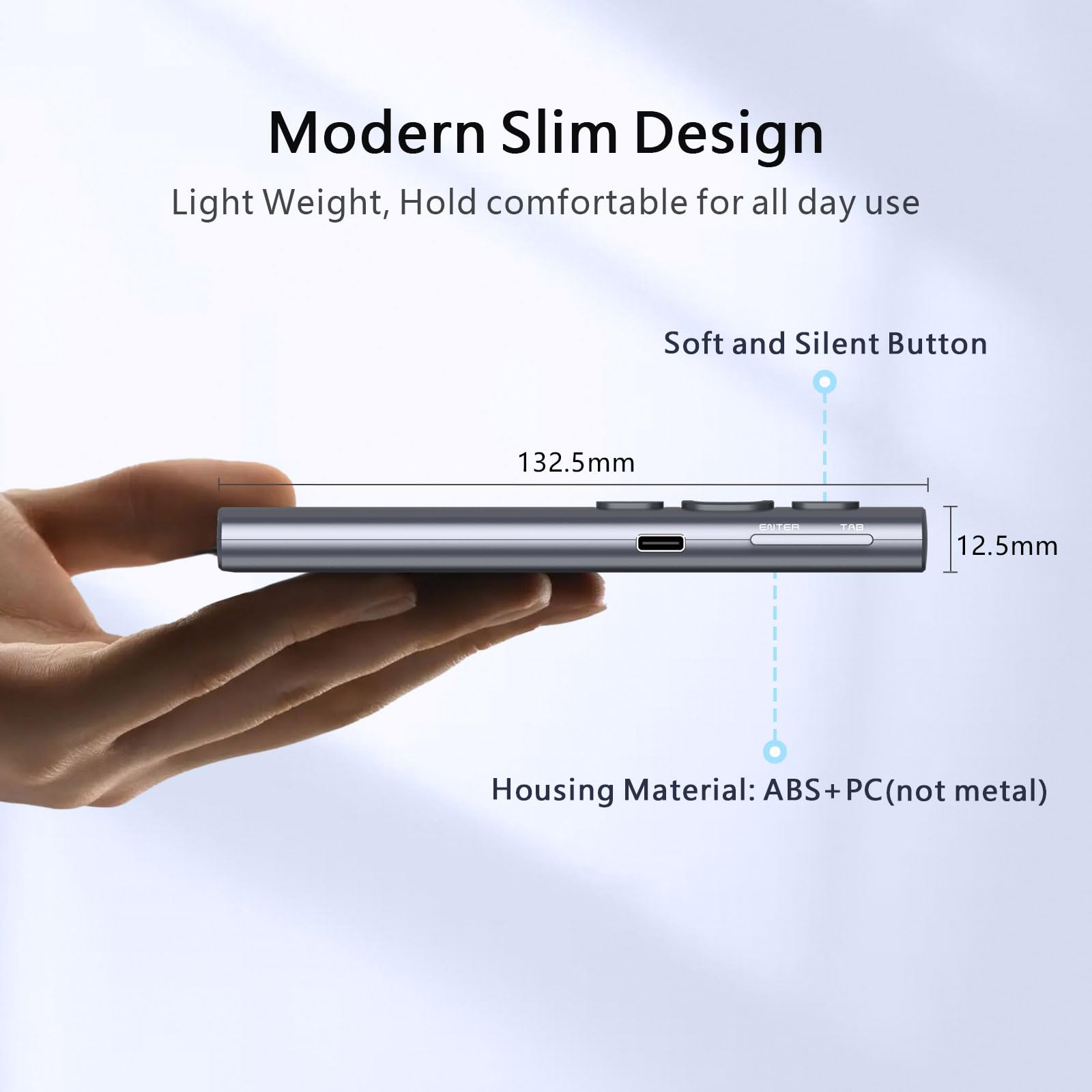 • High Capacity Rechargeable Battery - The wireless presenter is equipped with a 300mAh lithium polymer battery. With 2-3 hours fully charge, the presentation clicker can work for weeks. Indicator blinking slowly is low power alert. Charging via USB-C port and charging cable is included.