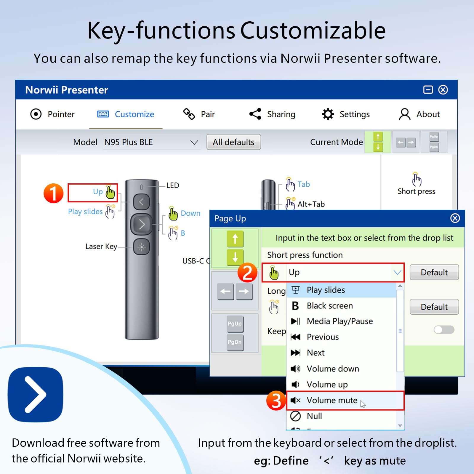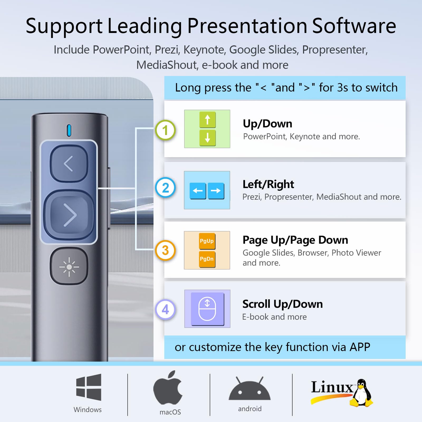 • Reprogrammable buttons - You can remap the button functions to suit your personal needs via Norwii Presenter app. Download the free software from Norwii Official. Long press the forward and backward button for 3 seconds to switch between the four function modes of the forward and backward button: up/down, left/right, Pgup/Pgdn, Scroll up/down.