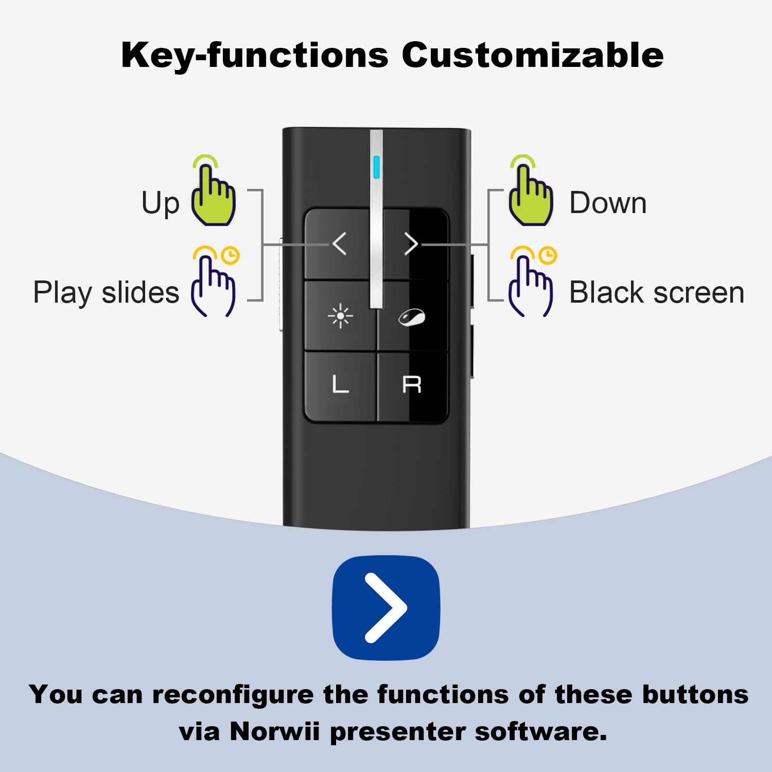 • Key-functions Customizable: You can reconfigure some of the key's function by Norwii Presenter APP to achieve a personalized presenter