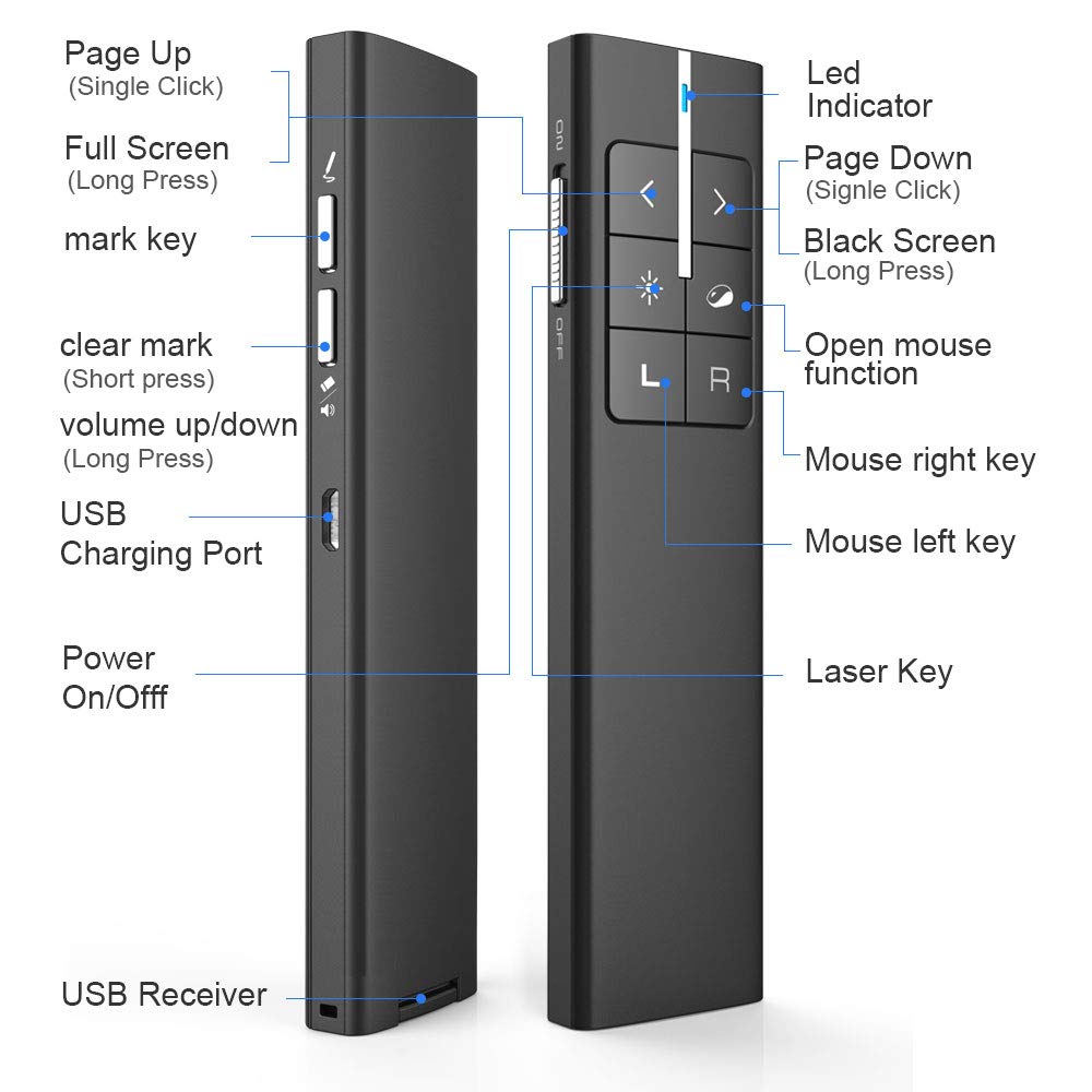 • Plug & Play and Easy to Operate: The presenter mouse is multi-functional: Move your hand in the air to mark / Erase, adjust volume, Play/Pause audio or video by air mouse, Full/ Black Screen, Page Up/ Down etc. No need to install any software, just plug the USB receiver into the USB port of your computer