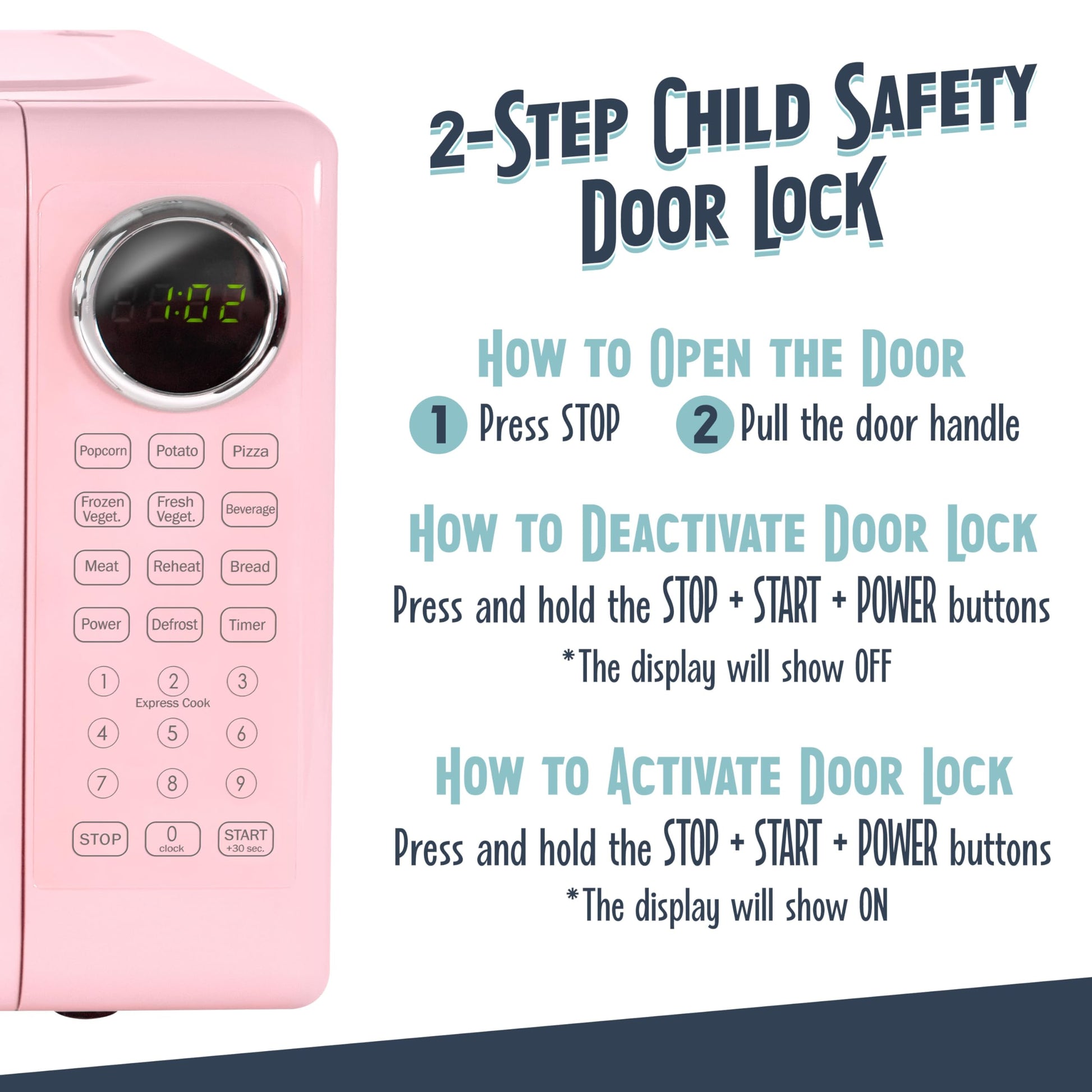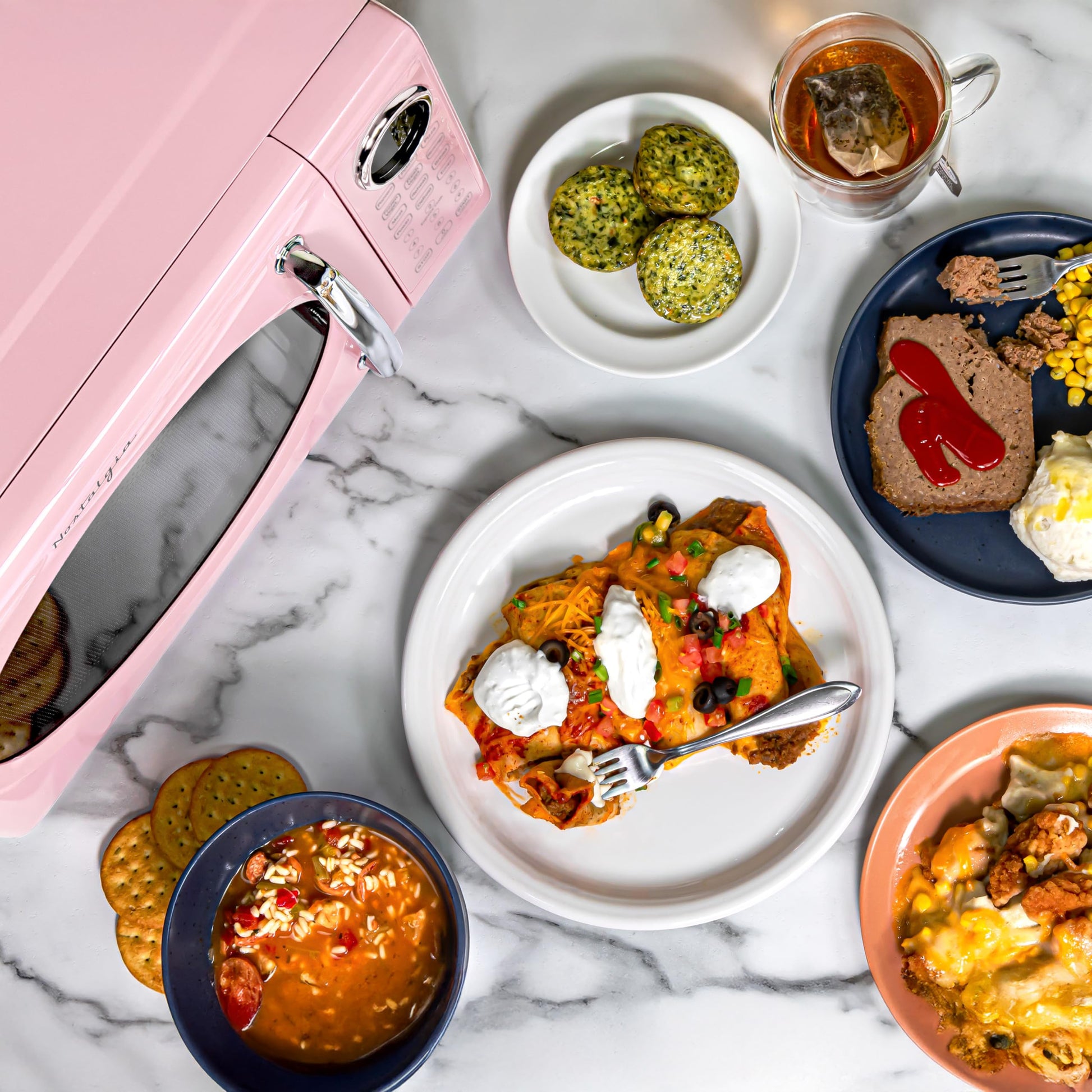 Nostalgia Retro Microwave Oven 0.7 Cu Ft, 700-Watt Countertop Size with Glass Turntable, Child Safety Lock, 8 Auto-Cook Programs, Digital Clock, Pink