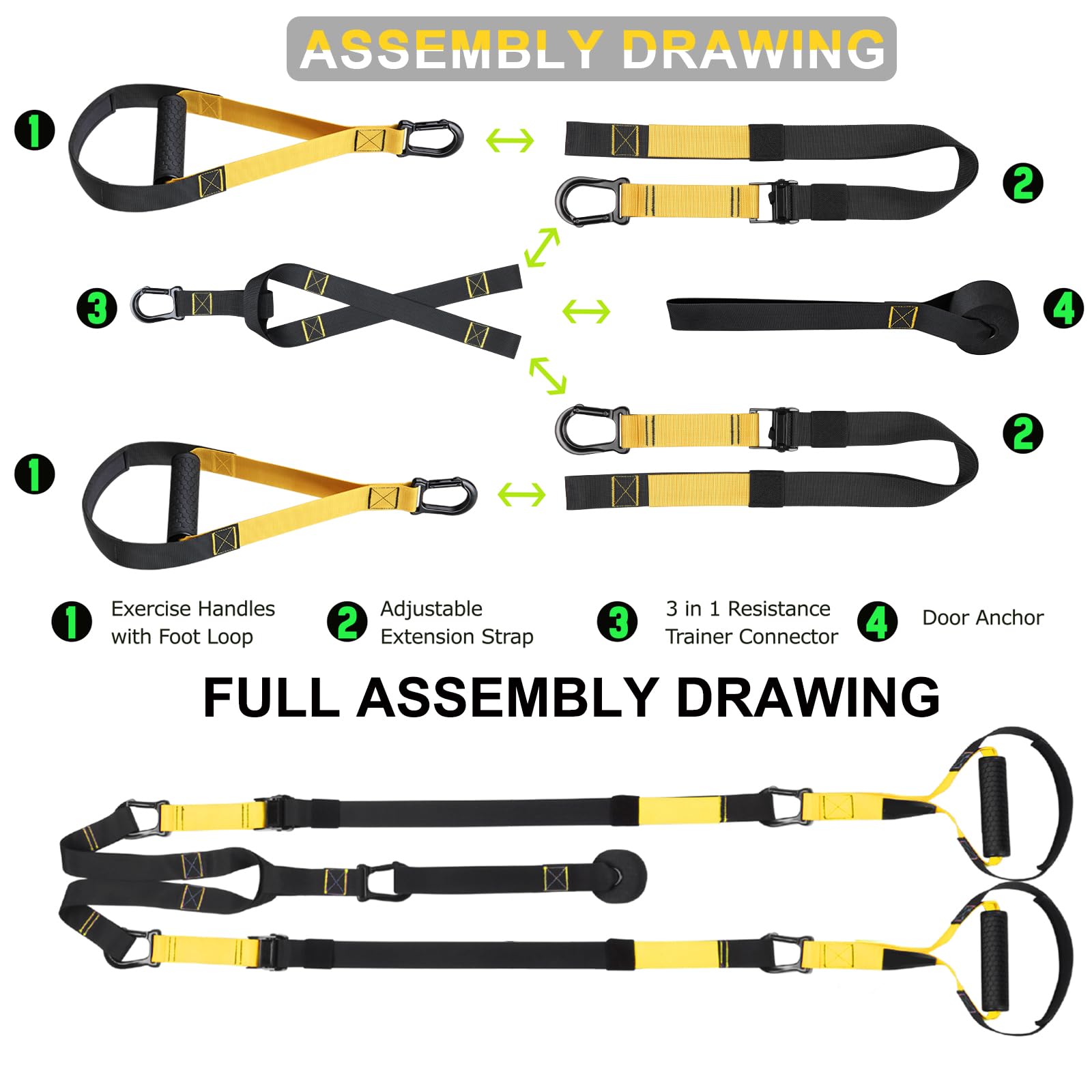 • PREMIUN QUALITY AND DURABLE COMPONENTS :Resistance Trainer Exercise Straps With Handles, Each attachment of our Resistance Training Fitness Workout Equipment is carefully constructed and in good quality, heavy-duty materials and fourfold sewing tech keep every part secure. Can max withstand up to 500 pounds of bodyweight and over 1000 pounds of resistance.