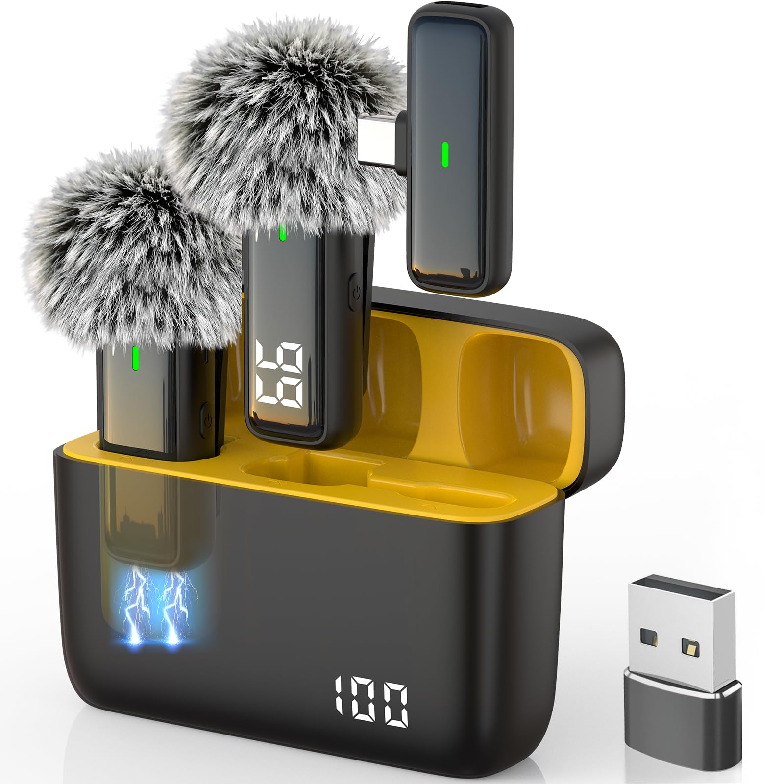 • Long-lasting Charging Case: The usb type c lapel mics work up to 24 hour with rechargeable charging case, last for 6 hours per microphone on a full charge. The number on the lav mics and chargeing case tell you how much battery they have left
