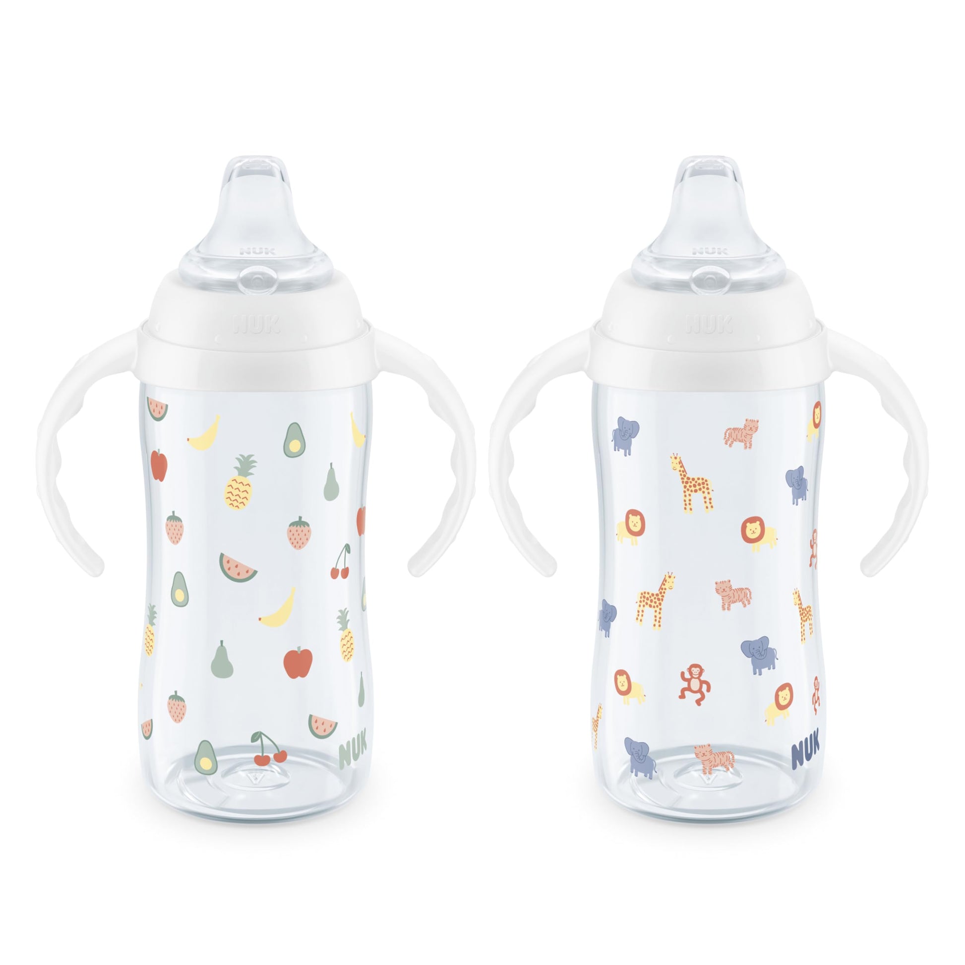 NUK Learner Cup, 8+ Months, Fun Fruits and Animals, Amazon Exclusive Collection, 10 Oz, Pack of 2, BPA-Free, Soft Spout, Spill Proof Sippy Cup