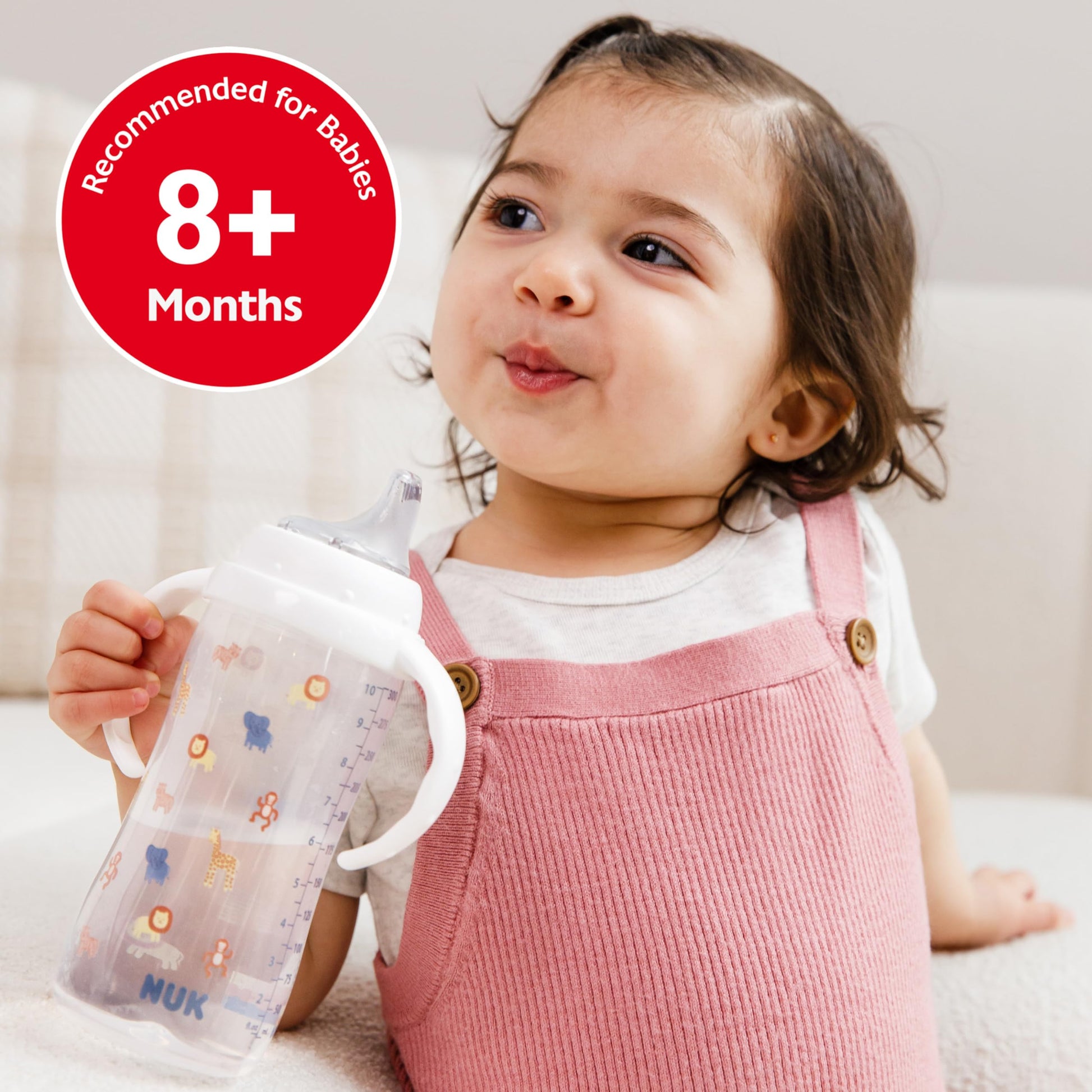 Details: The NUK Learner Cup easily promotes baby’s transition from breast or bottle to sippy cup. This learner cup features a spill-proof soft spout that is gentle on teeth and gums, and it includes an air vent that helps reduce swallowed air. The cup also comes with easy-to-grip, removable handles that your growing child will love. NUK Learner Cups are BPA-free and dishwasher-safe. Our 10-oz. learner cups are recommended for ages 8 months and older.