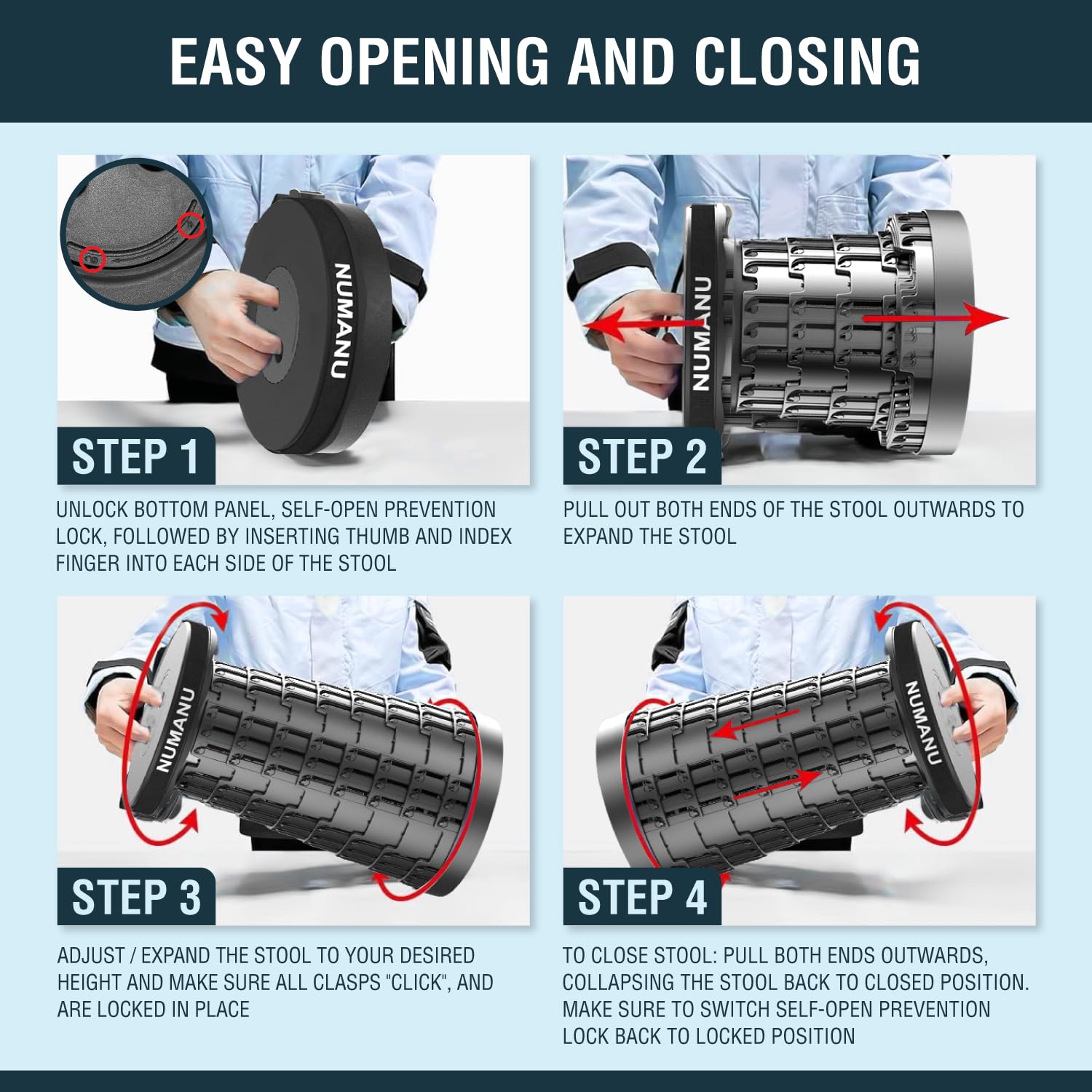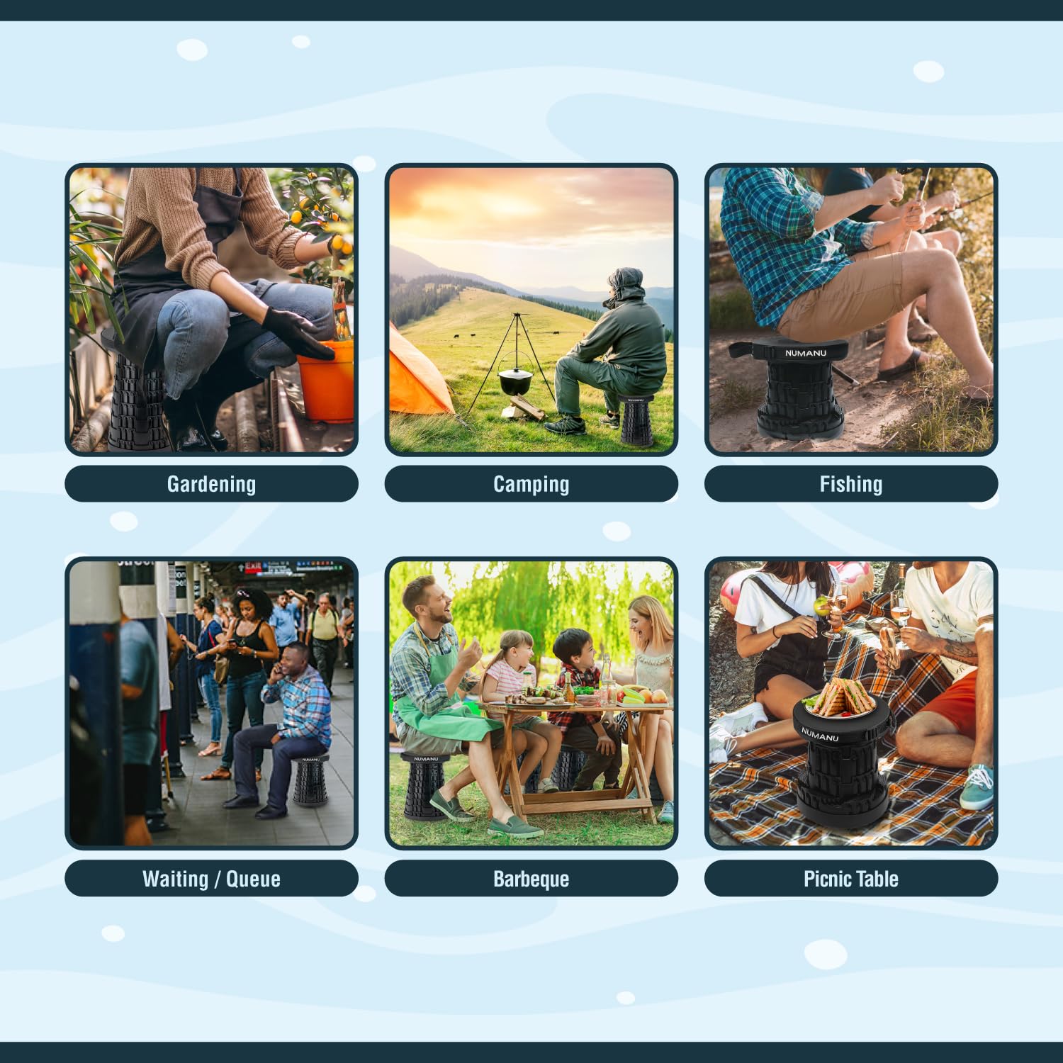 • 🔥【ENDLESS OPTIONS】NUMANU Portable Telescoping Collapsible Stool has many use cases such as: Camping, Hiking, Waiting in Line, Live Concert Events, Plumbing, Construction, DIY/Fixing, Fishing, Gardening, Resting, Travel, Commute, Bus, Train, Subway and More...