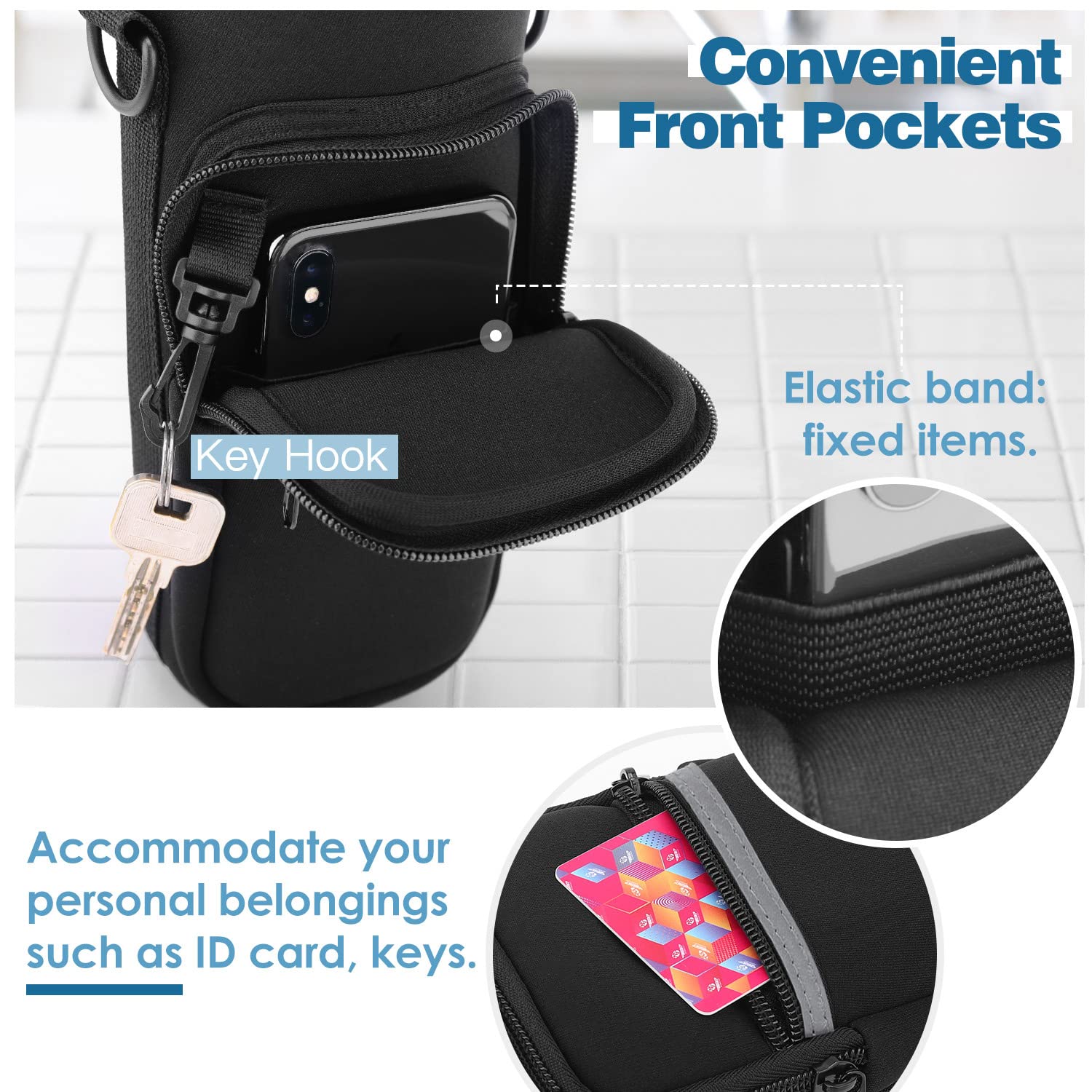 • 2 POCKETS: The small zipper pocket is for cash and card, the large zipper pocket is for smartphone, keys, and other essentials. When you go out, you just need to bring this water bottle bag, no need to carry the bag to hold these small items.