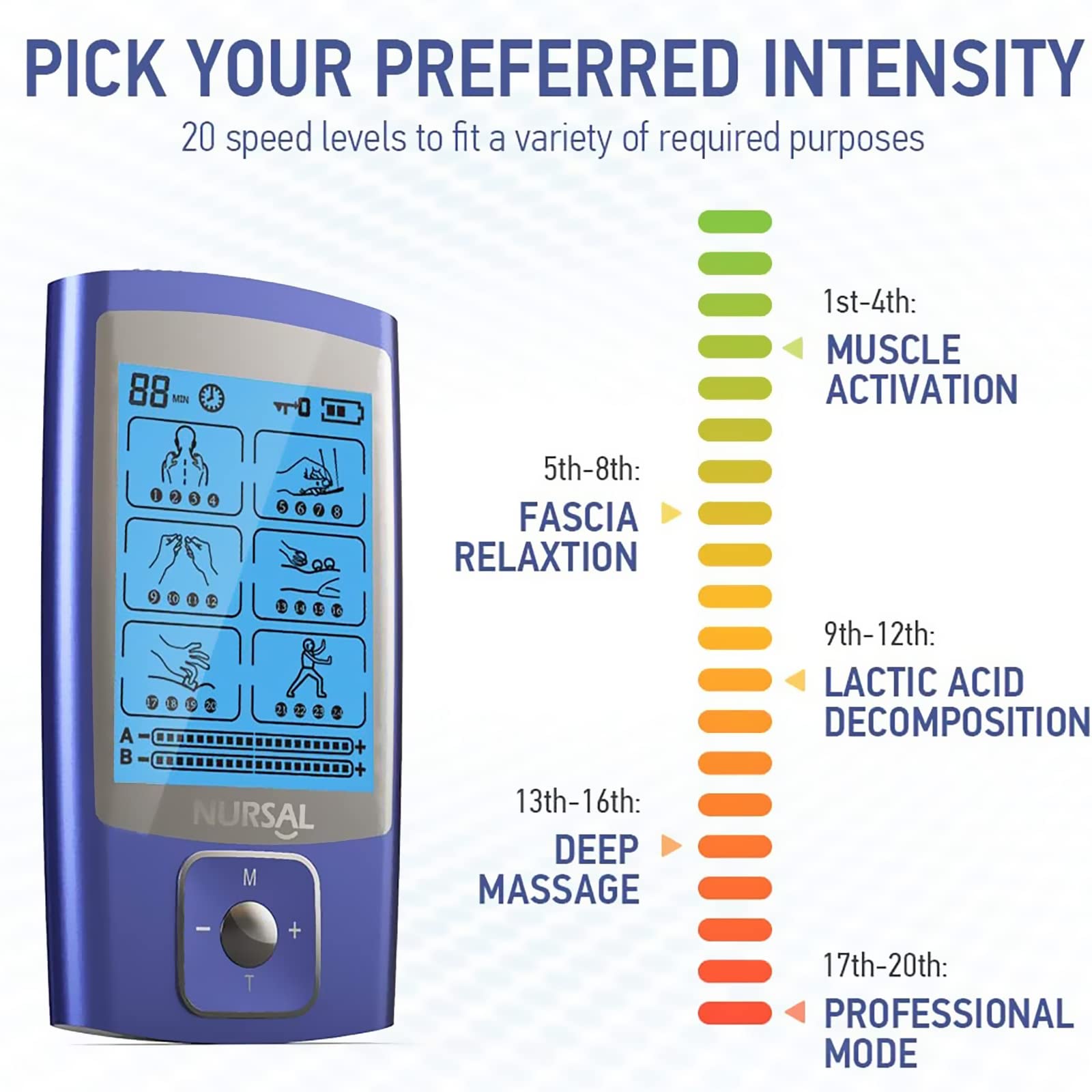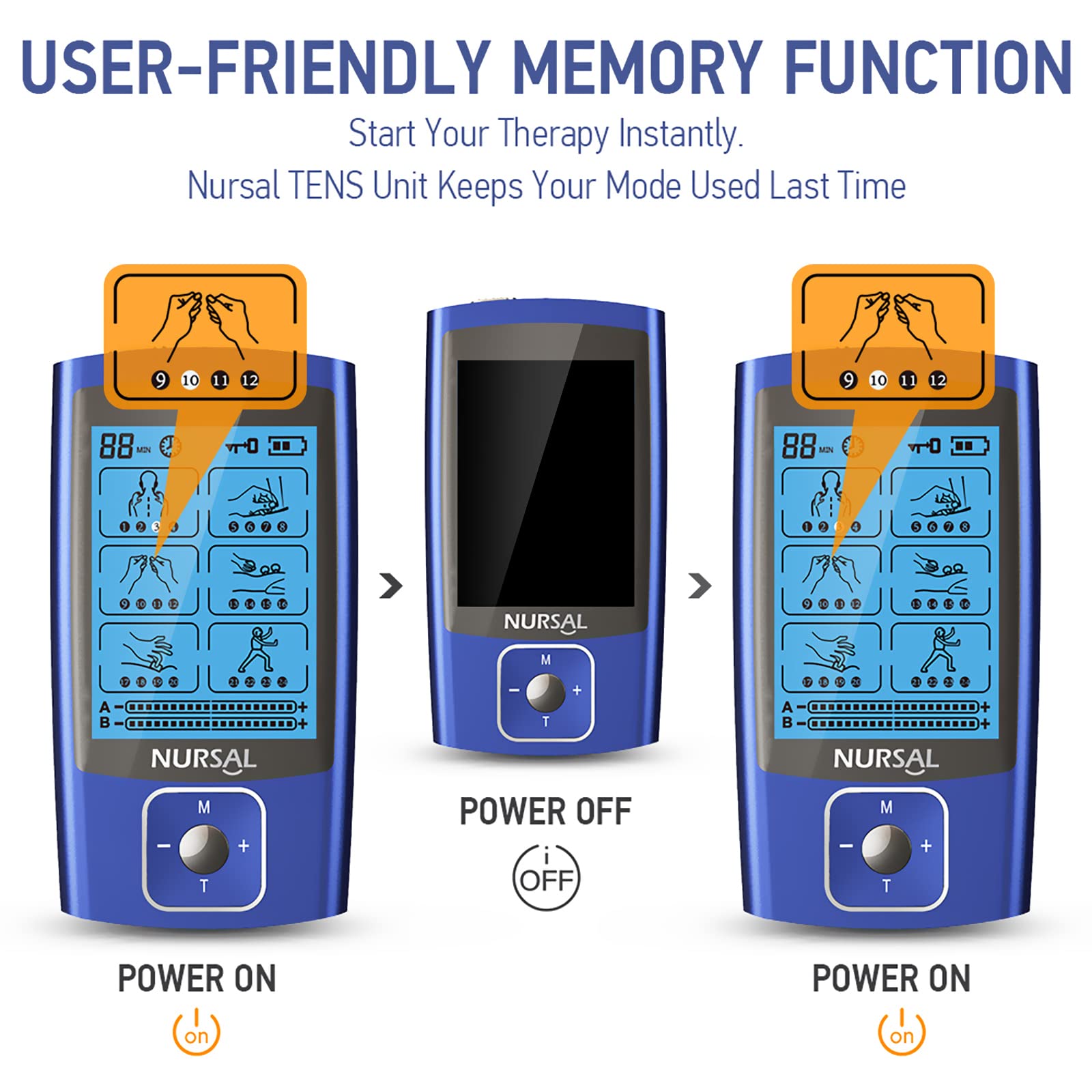 • A/B DUAL CHANNELS TENS: You can set separate modes and intensities for channel A and channel B, the TENS machine last memory function will remember your preference of mode setting. Relax your body and relieve general body pain anytime with NURSAL electrotherapy muscle stimulator pulse massager and accessories.