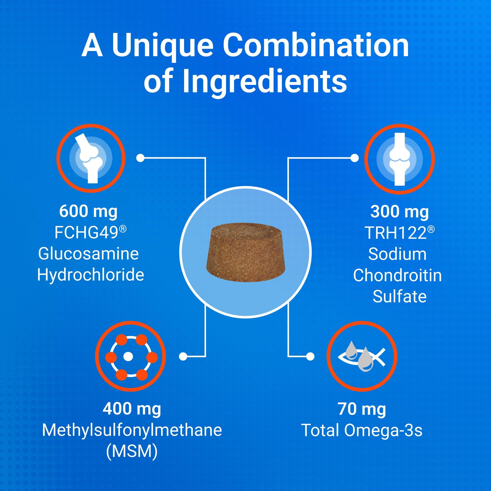 Details: Only COSEQUIN is COSEQUIN. COSEQUIN Joint Health Supplement Plus MSM & Omega-3s contain FCHG49 Glucosamine Hydrochloride, TRH122 Sodium Chondroitin Sulfate, MSM (Methylsulfonylmethane). This combination of ingredients helps maintain your dog’s cartilage and connective tissue. Each soft chew also contains omega-3 fatty acids to help support skin & coat health. COSEQUIN supplements have been used since 1992 in animals to maintain joint health. COSEQUIN supplements have been shown safe, effective, and absorbable in peer-reviewed, published, controlled, U.S. veterinary studies. Each batch of COSEQUIN is subjected to stringent quality control measures and meets label claim.
