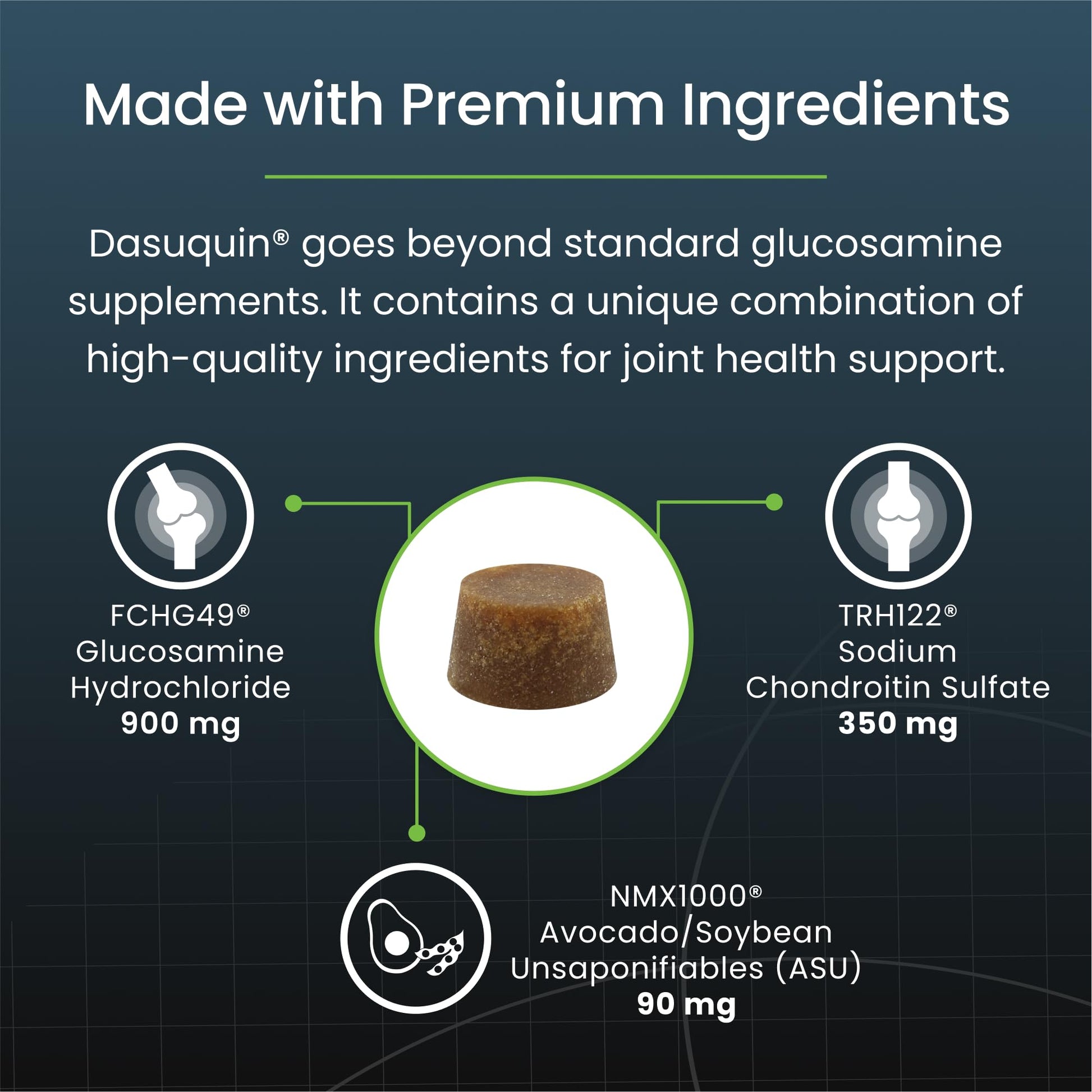 Better Together with ASU - Dasuquin goes beyond standard glucosamine supplements with avocado/soybean unsaponifiables (ASU), a unique ingredient that works synergistically with glucosamine and chondroitin to help support healthy joints and cartilage.
