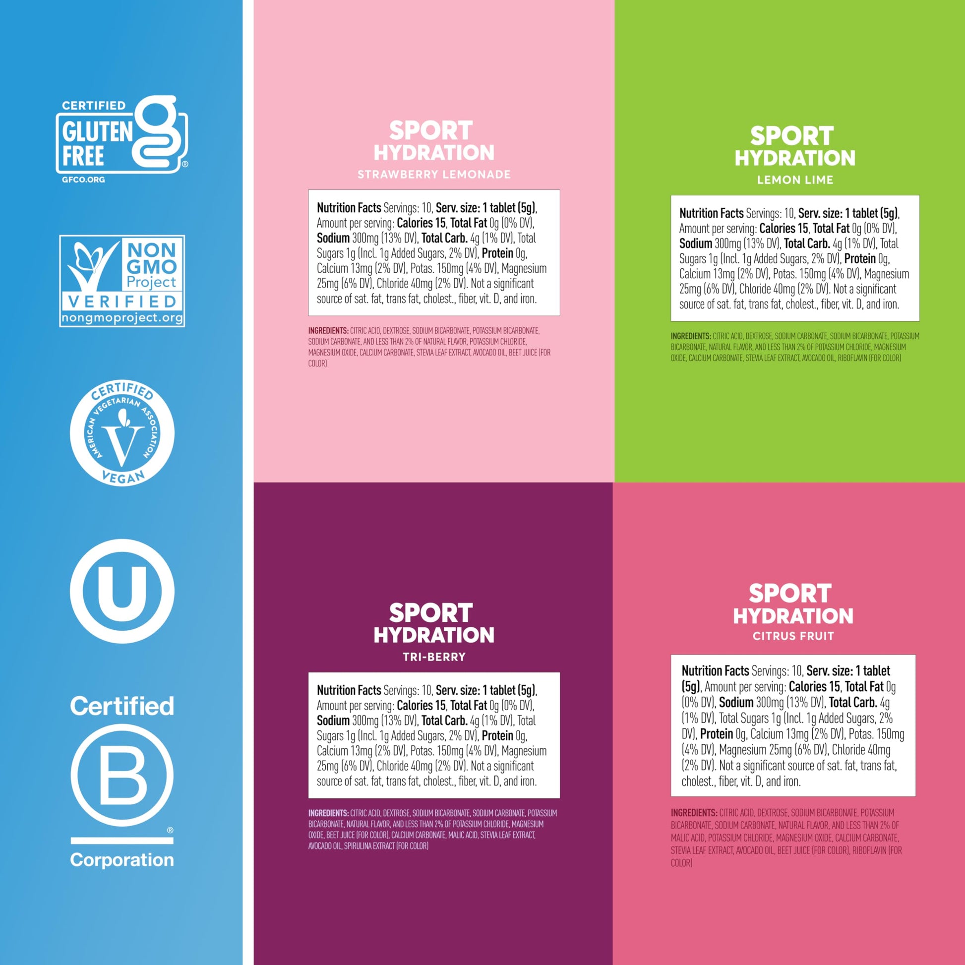 GREAT-TASTING ELECTROLYTE TABLETS: This Nuun Sport 4 pack contains 1 tube of each refreshing flavor: Strawberry Lemonade, Lemon Lime, Tri-Berry, and Citrus Fruit for a total of 40 servings
