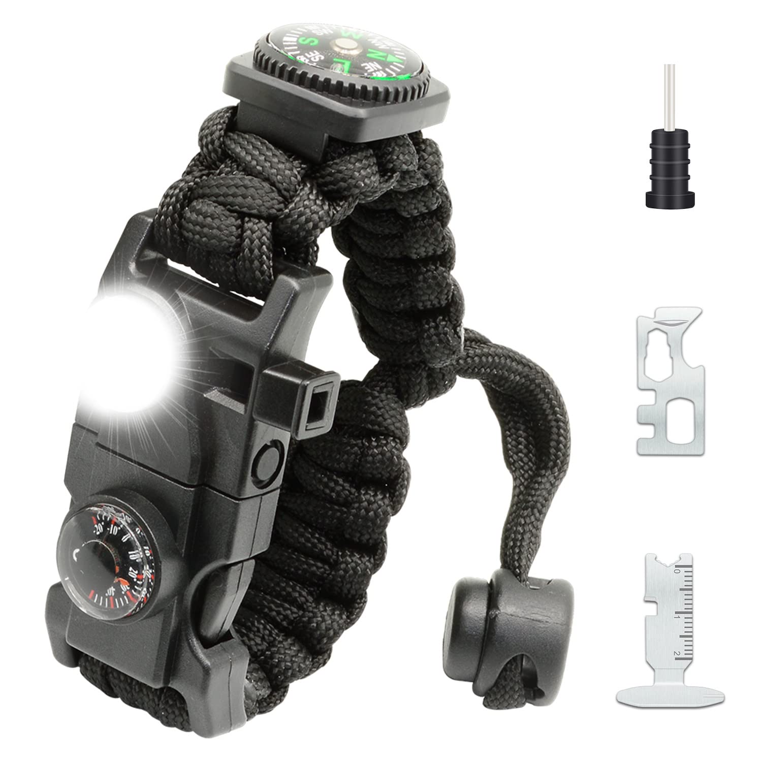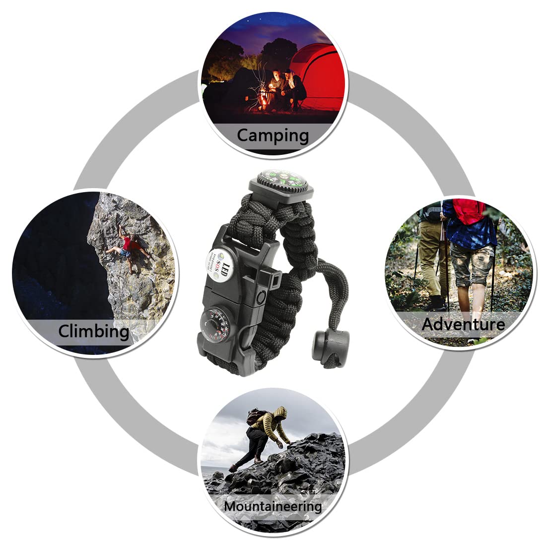• 【10ft Paracord Bracelet & Thermometer】:The paracord can withstand weight up to 550lb (249kg); paracord bracelet can be loosen up to 10 feet in any situation when strong rope or cordage is needed. Good to stabilize a tent to build a shelter, create hunter traps, hiking rope and so on. Thermometer is ideal to know local real-time temperature quick(in Celsius)