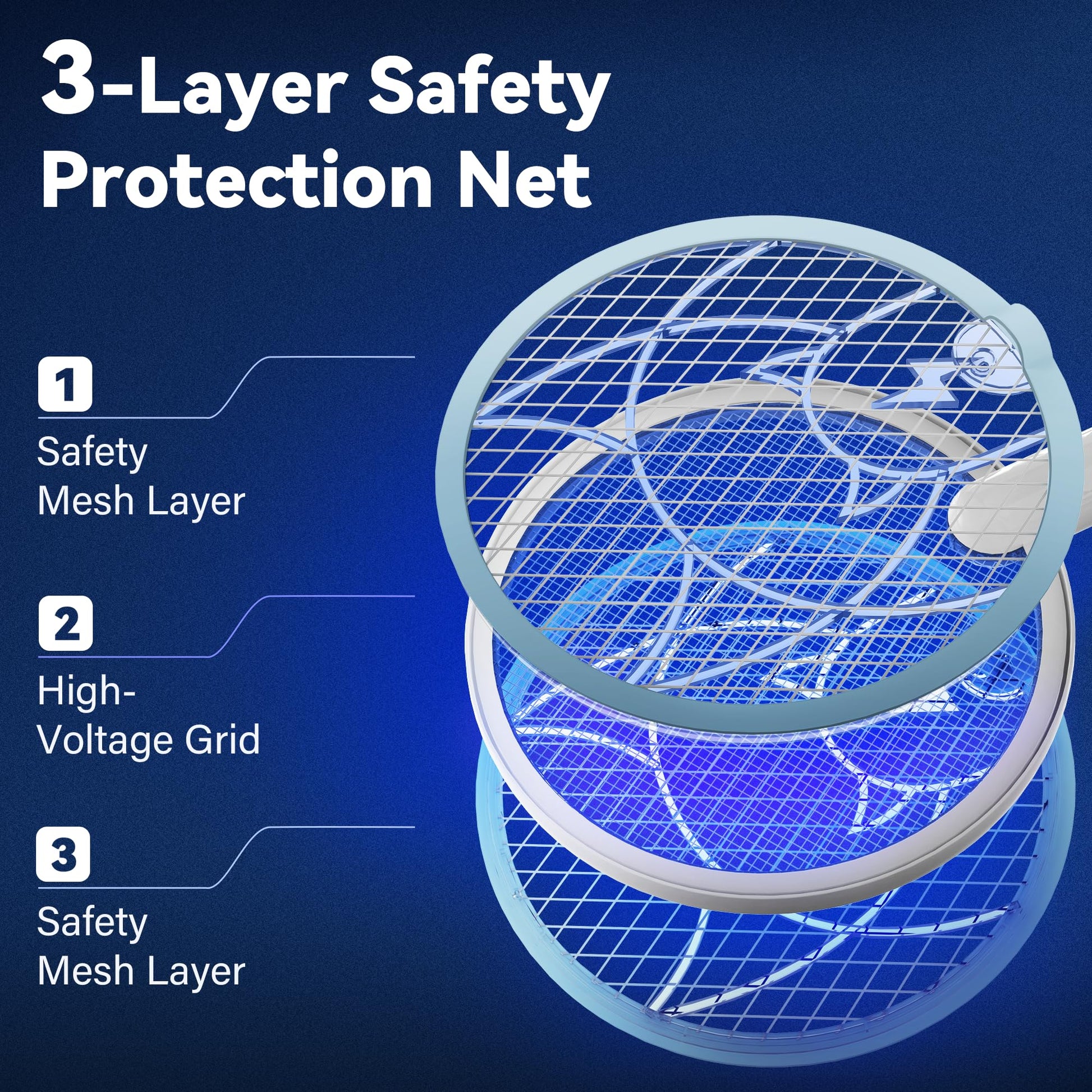 • ⚡ Safe & Easy to Use - Featuring a 3-layer protective mesh, this handheld bug zapper prevents electric shock from accidental contact, making it safer for family use. Simply press the button to activate the electric fly swatter and start zapping!