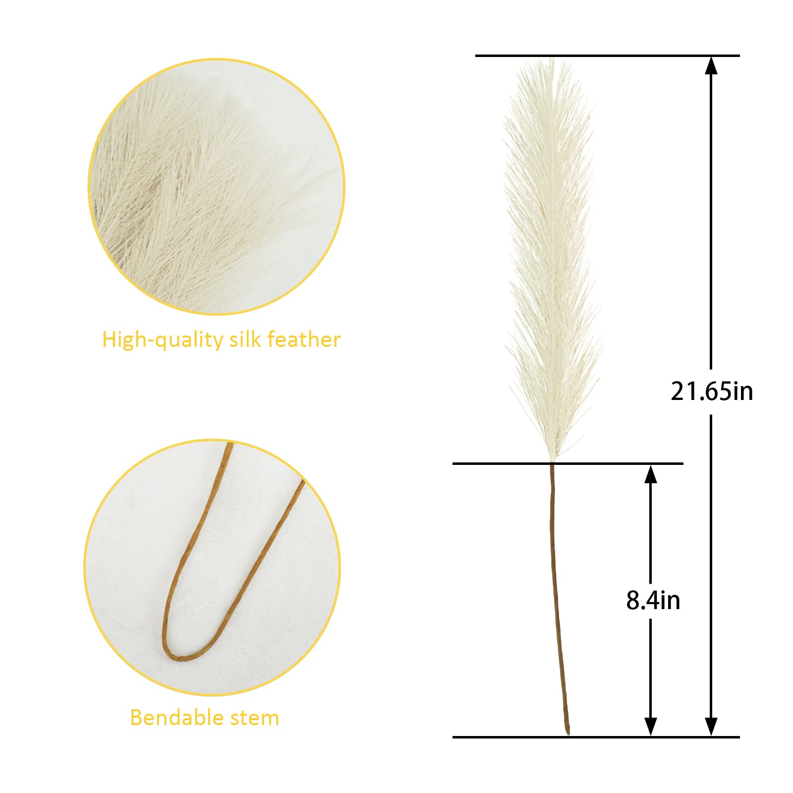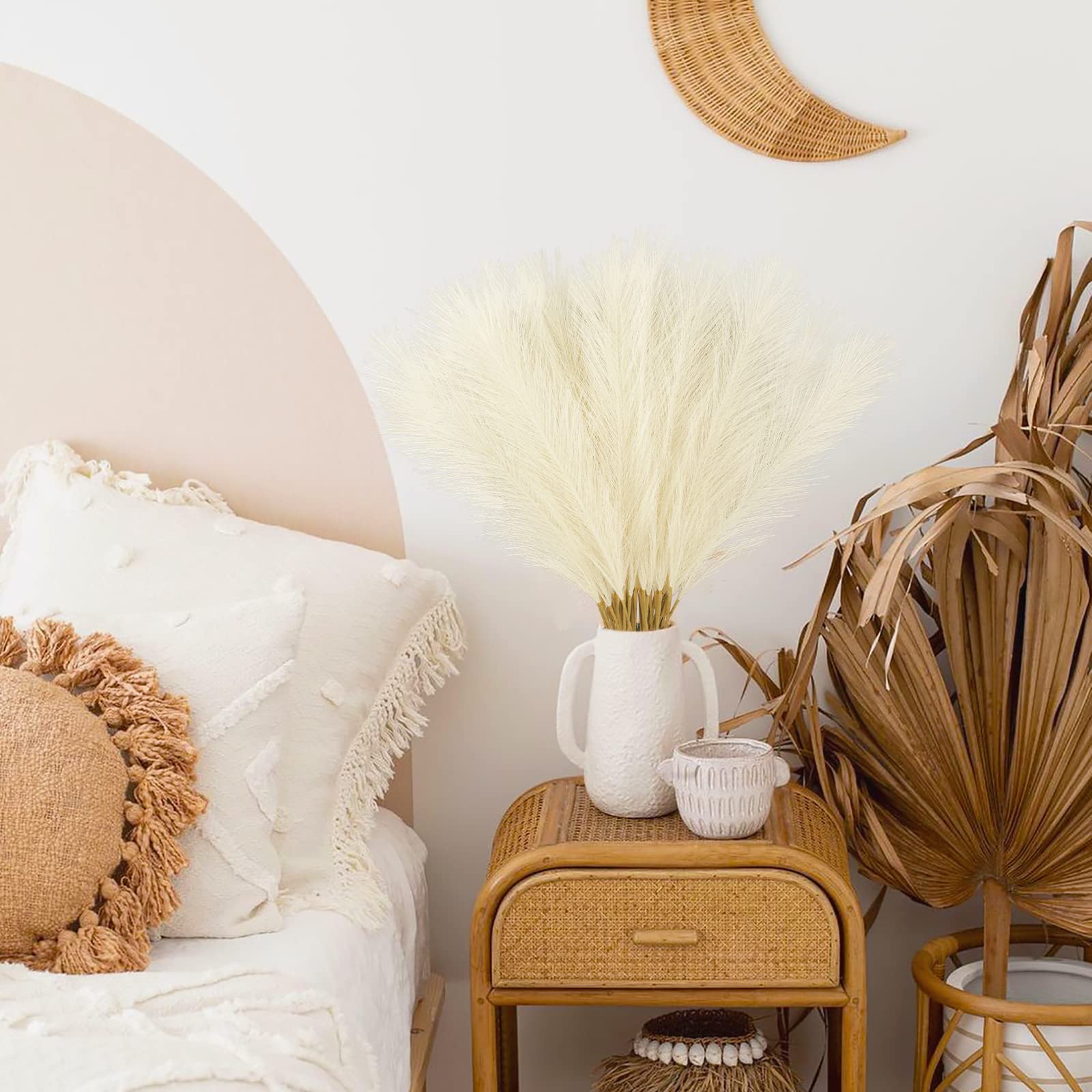 • Beige Pampas Grass Decor: You will get a pack of 50pcs artificial pampass grass, each stem 21.6”, and the heads of each stem is designed you can fluff them up for a fuller look, create a chic minimalist, or Bohemian modern display to complement your existing home arrangement