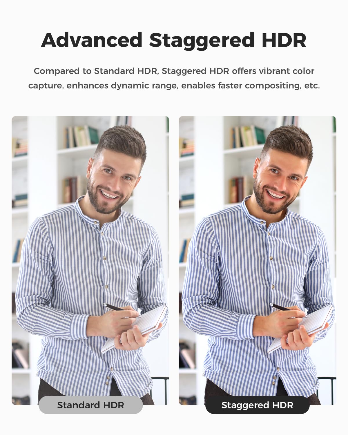 • 【Shine in Low Light】Breakthroughs in low-light performance set our streaming camera apart. Equipped with 1/2.8” Stacked CMOS, Dual Native ISO, 2.9 μm Pixels Size, Staggered HDR, 12 Bit dynamic color range ensure excellent video quality in any lighting condition.