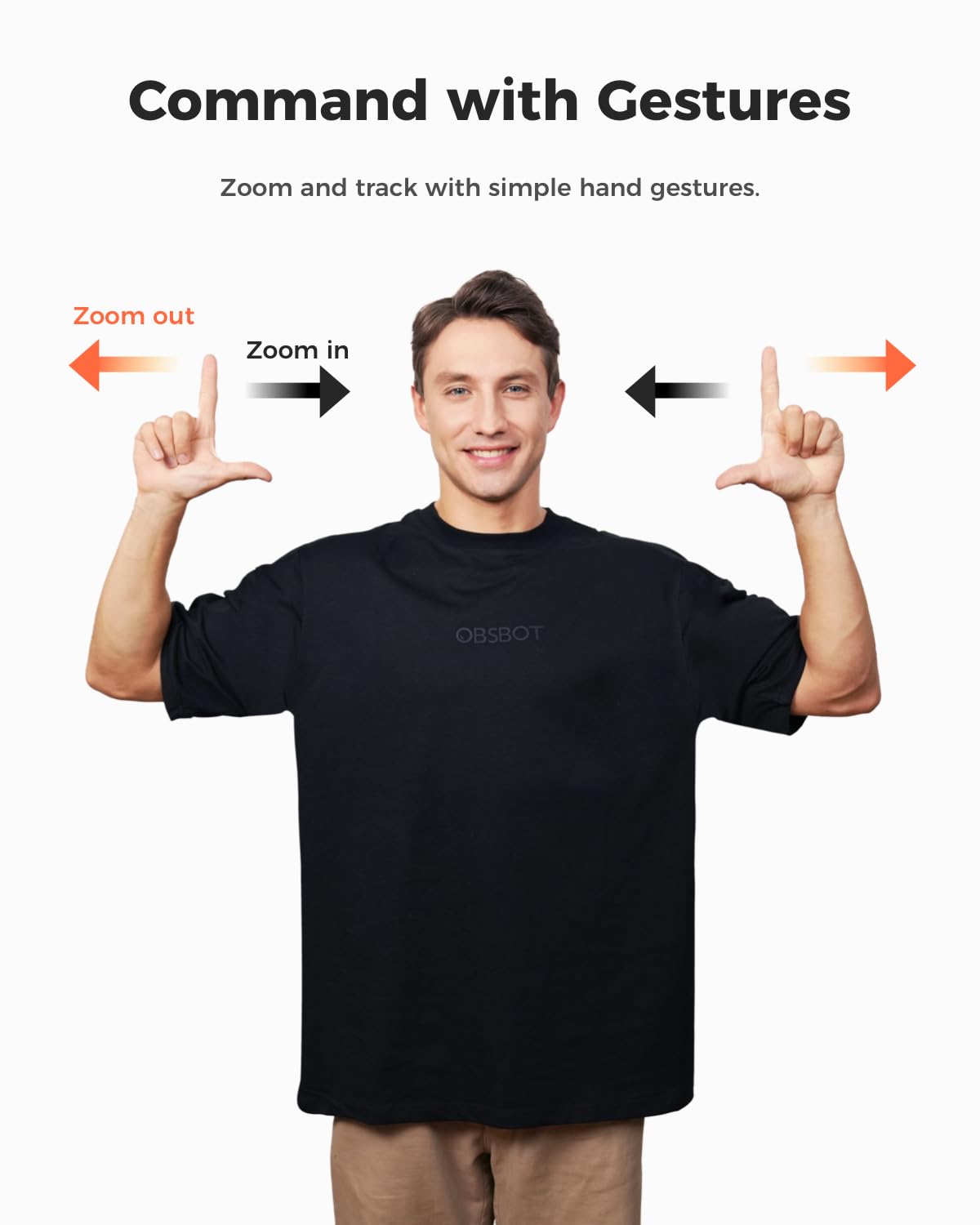 • 【Dynamic Gesture Control】 Along with the 2.0 dynamic gesture control, our streaming camera says goodbye to cumbersome manual operation. Simply face the web cam, make an “🖐” gesture to lock the portrait tracking target, and make an “👆” gesture to control the zoom easily.